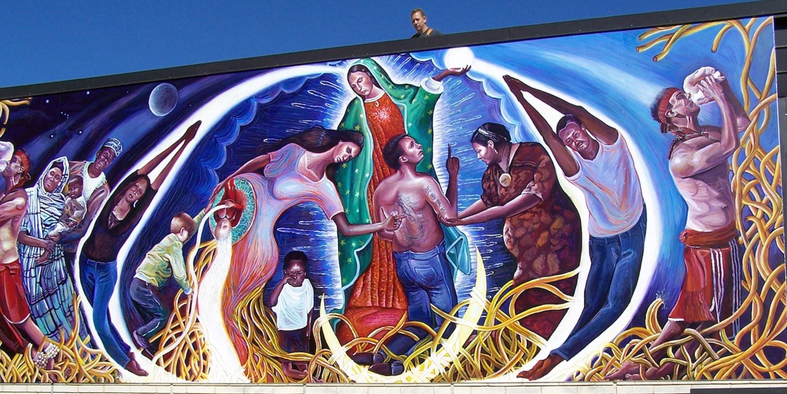 The mural, entitled “Hope and Determination” (2007), depicts the Virgin Mary at the center of the composition, flanked by figures whose bodies curve inward to form a circular enclosure. The figures are depicted atop radiant blue with tendril-like plant elements radiating upward from the bottom of the composition, meant to symbolize both Catholic and Indigenous spirituality. The figures, all persons of color, include members of the artist’s own family, combining the deeply personal with a communal message of faith.