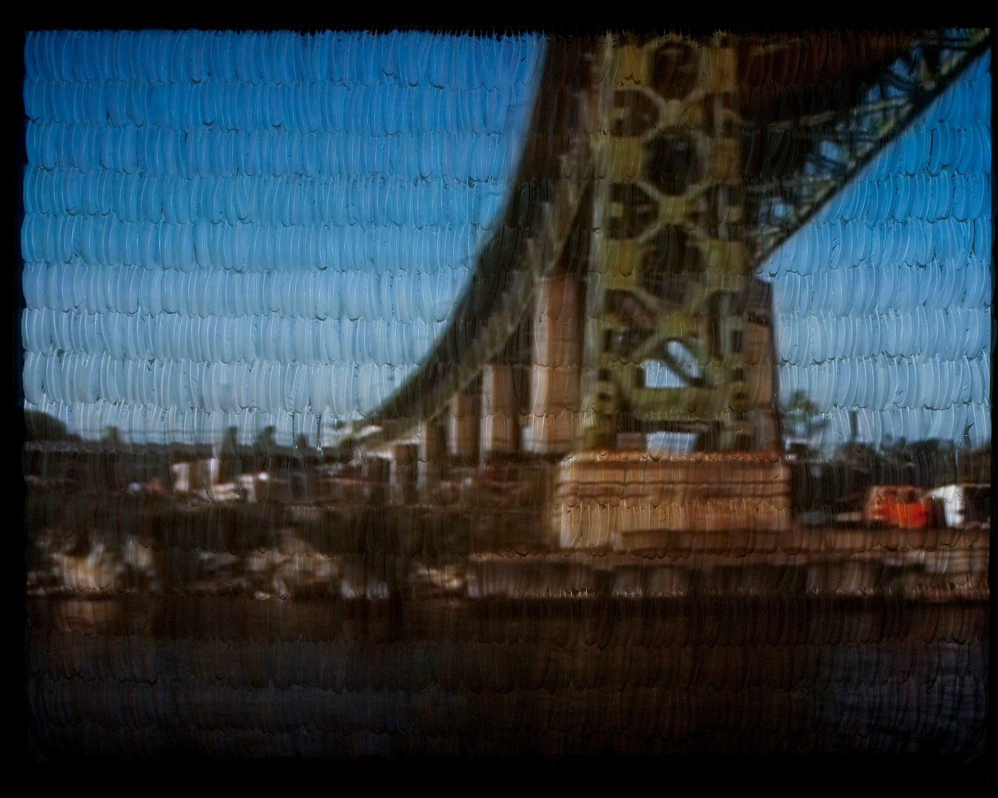 Nation, the exhibition’s second chapter, speaks about the long history of military service to which Indigenous people have subjected themselves, most notably in Tom Jones's photographic series Ho-Chunk Veterans. The images feature what Jones refers to as “memorial poles” for every fallen service member, each consisting of a framed photograph of the tribal member as well as a small bowl of offerings, including their favorite cigarette brands, lighters, and other ephemera. The title “Nation” also refers to sovereign and separate Indigenous nations, movingly communicated in Alan Michelson's video “Mespat” (2001). Projected onto a screen laboriously constructed of turkey feathers, the camera continuously pans the 3.5-mile shoreline of Newtown Creek, an estuary dividing Brooklyn and Queens. Mespat refers to a passage along the route known to the native Lenape as “bad water place,” and from which they were displaced by European colonists in 1642. Ambient sound accompanies the video, providing the sensation of bobbing along the waters ourselves, watching the urban landscape shift and turn in real time.
