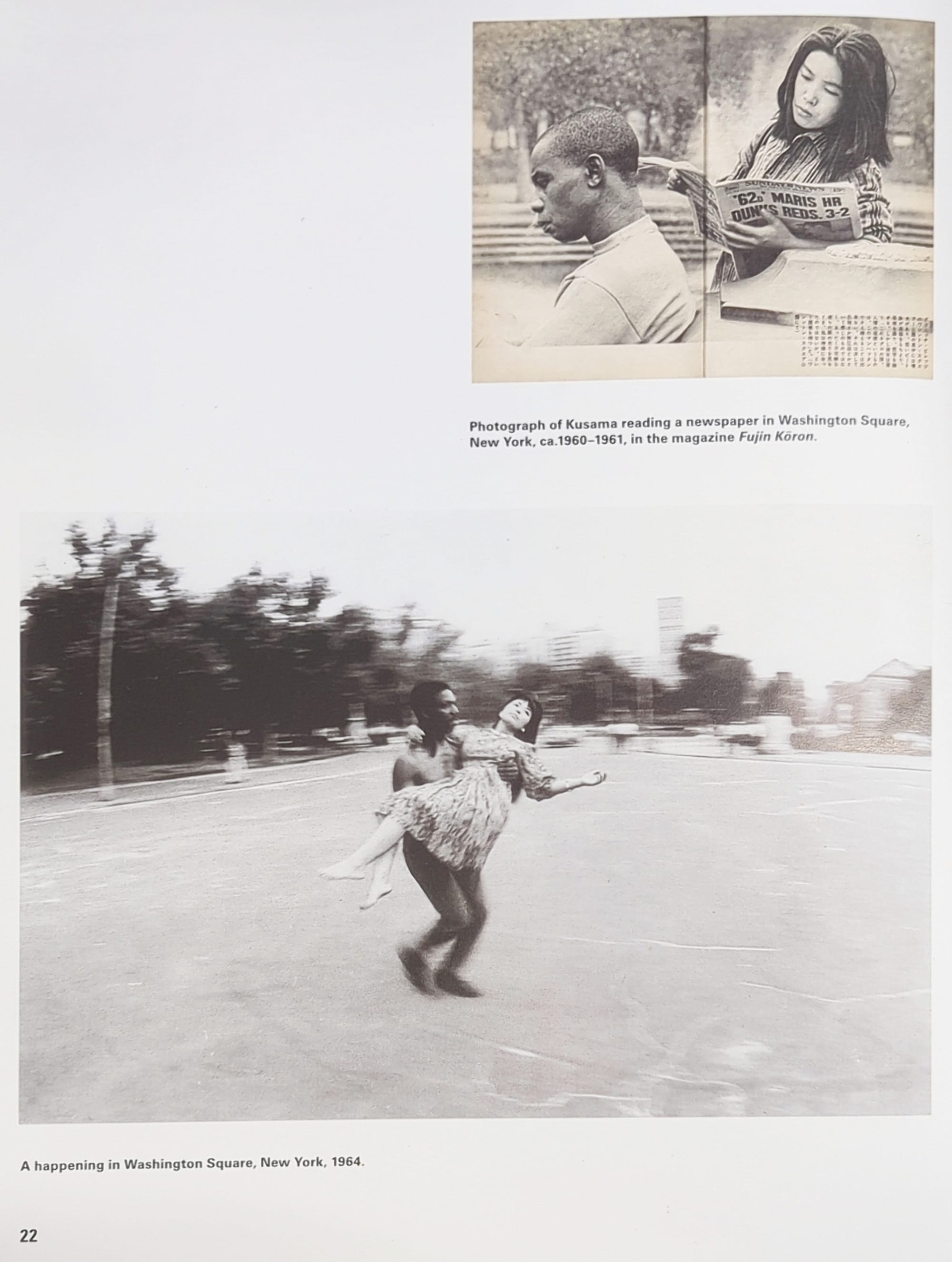 In the very first essay of 1945 to Now, we are shown a picture from 1964 of Kusama being physically carried through Washington Square Park in the arms of a bare-chested Black man. Above this, a clip from a Japanese magazine depicts Kusama reading a newspaper, as a Black man angled below her stares blankly at the ground. He is unnamed, and in the original quote from that magazine, Kusama refers to him not as a collaborator, or even as a human being, but instead speaks of “The head of this Negro.”