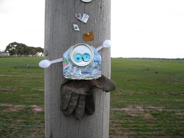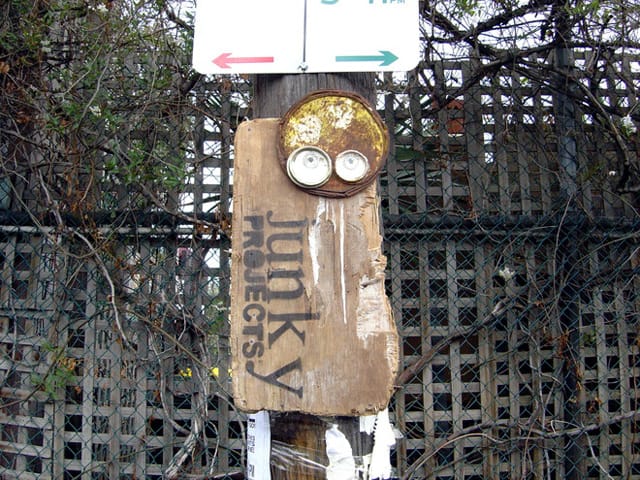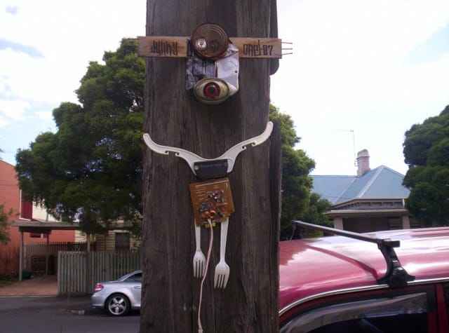 MELBOURNE, Australia — Empty cans, bits of plastic, wire, and wood are common sights in city streets. Some of it is very familiar, like the bottle cap embedded in the tarmac out the front of my neighbor’s house that has been there for years. Graffiti, wheat-pasting, and stencils are a common sights in the inner city streets in Melbourne, Australia. Then one day I walked into a little street in Melbourne’s inner city suburb of Fitzroy and saw the two combined staring at me — street art sculpture made of junk with the tag: Junky Projects.
