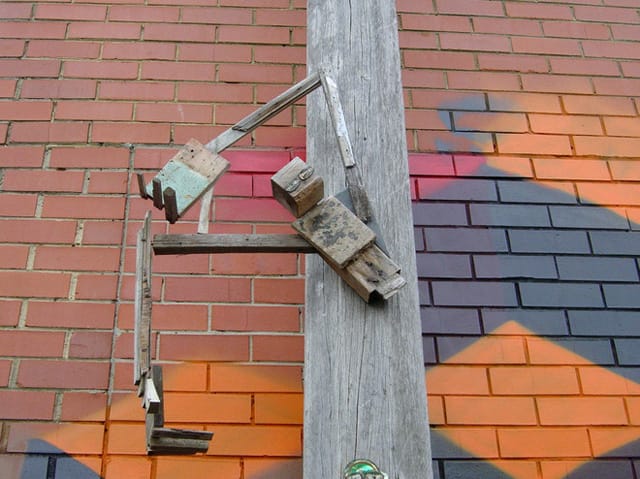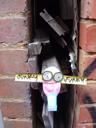 Junky Projects was a game changer for visual tagging, tagging by using an image rather than text, both in the media and the meaning. But the Junky Projects aren’t adding aerosol spray paint to the street, the rubbish comes from the street and it is being returned to the street transformed and “up-cycled.” In common with other forms of tagging the junk men form linear trails marking where the artist has travelled. The visual tag becomes a logo that identifies the artist but Junky Projects builds his brands recognition recycling other branded items. There is an aspect of naming and shaming the companies that produce stuff that litter the streets by nailing it up again.