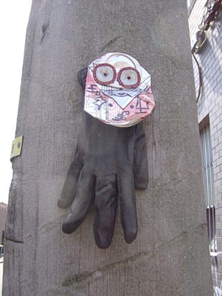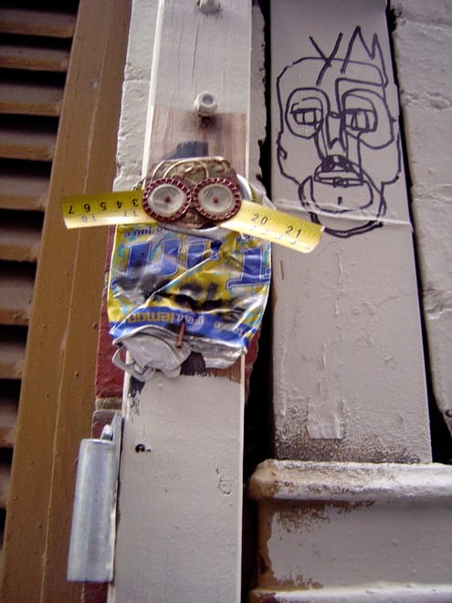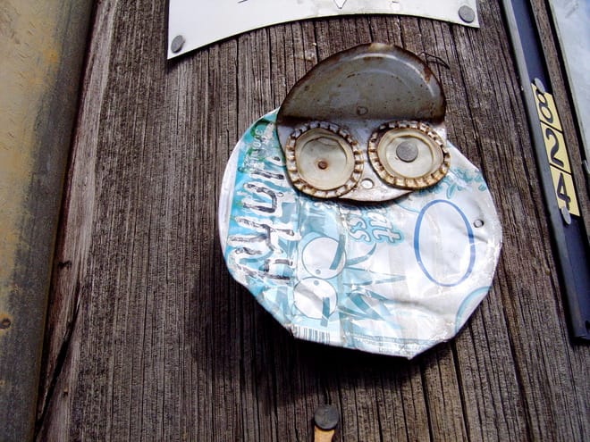 Since then I have been seeing these faces with increasing regularity. They look like the street art equivalent of Dada sculptures or those of the post-war San Francisco sculptor, Art Grant. Made of drink cans, bottle caps, tin cans, tape measures, a leather glove, a leather belts, plastic straps, plastic lids, plastic bottles, and scraps of wood that had all been found on the streets. The only new materials used are the nails.