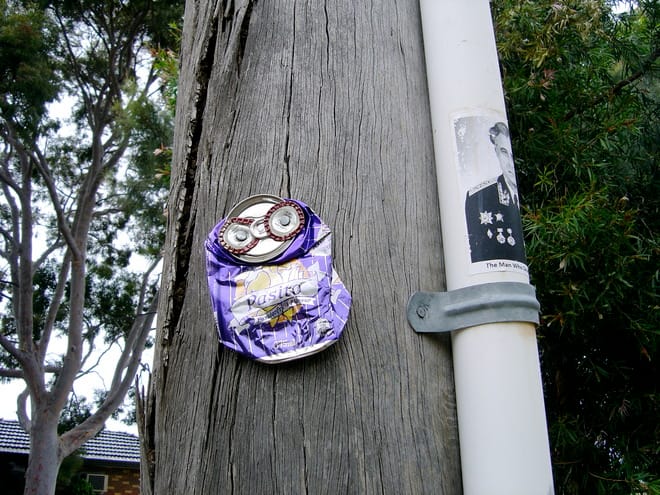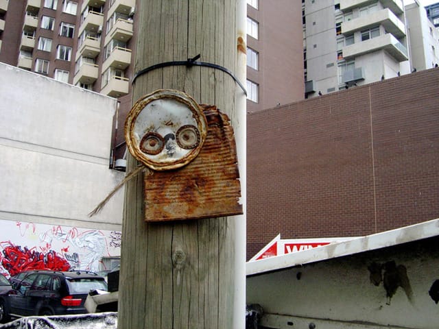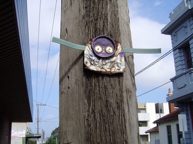 MELBOURNE, Australia — Empty cans, bits of plastic, wire and wood are common sights in city streets. Some of it is very familiar, like the bottle cap embedded in the tarmac out the front of my neighbor’s house that has been there for years. Graffiti, wheat-pasting, and stencils are a common sights i
