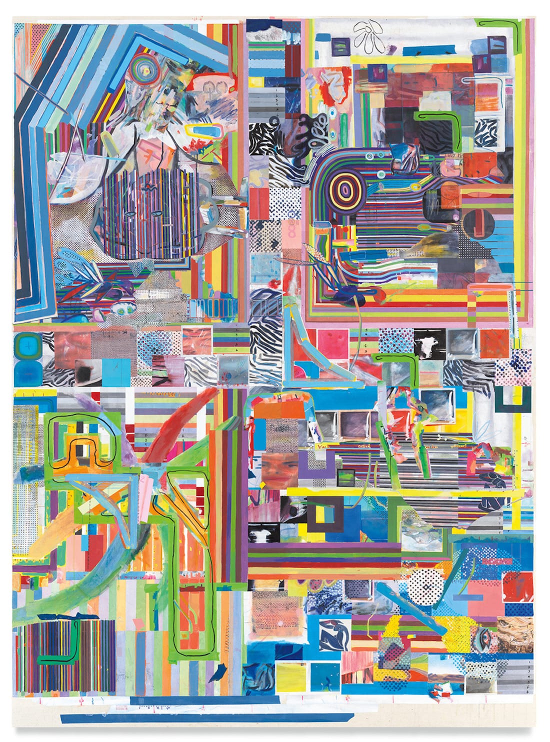 What keeps our attention is Evans’s use of different techniques, which reflects his resistance to settling into a stylistic groove. In “pigmentpolymersplatspace” (acrylic on canvas, 70 by 68 3/4 inches, 2021), phallic shapes extend in from the painting’s four sides. Along the bottom left edge, images of Matisse’s fauvist “Self Portrait in a Striped T-shirt" (1906), the artist’s only self portrait where he is not standing or holding a brush, has been cropped, stretched, and rendered in blue.