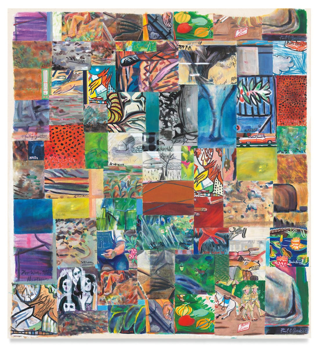 By juxtaposing some of the landscapes with the abstractions, particularly along the painting’s right and left side, Evans underscores the sense that these different elements may or may not fit together. Having to reorient these views in the mind’s eye produces the sense that Evans’s miscellany is undergoing change. This is a reminder that we cannot possibly process the barrage of images we encounter in our daily lives, much less make a reassuring order out of them.