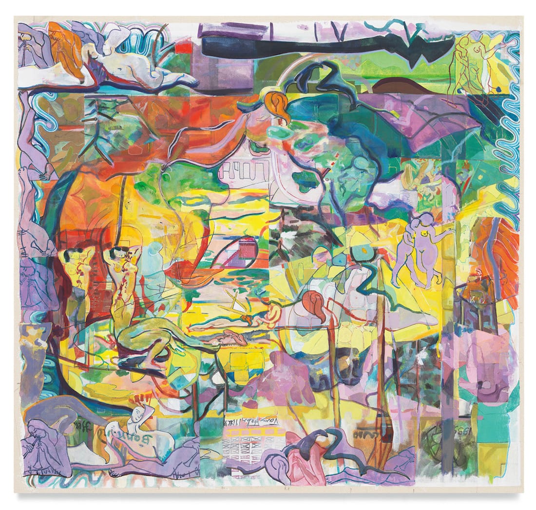 The one artist that Evans keeps returning to in this exhibition is Henri Matisse. In “joysdivision” (acrylic on canvas, 30 3/4 by 35 5/8 inches, 2021), Evans expands in a number of ways on Matisse’s innovative painting “Le bonheur de vivre” ("The Joy of Life," 1906). In addition to alluding to Matisse’s idyllic painting, Evans’s title refers to the punk rock band Joy Division and the Nazi concentration camp brothels the group based its name on, as well as the strategy of dividing the painting into parts and motifs, which are repeated, enlarged, overlaid, and rearranged.