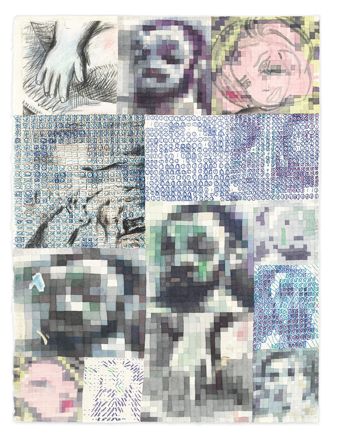 In the three works on paper, Evans uses watercolor, ink, and graphite on gridded paper to explore pixilated views, abstraction, and legibility. For "selfportraitwithmatisse" (15 1/8 by 11 1/4 inches, 2019), he divides the grid into different-sized rectangles. The rectangle nestled in the upper left-hand corner contains a hand he has drawn in pencil, underscoring his commitment to being directly engaged in the making of his work.