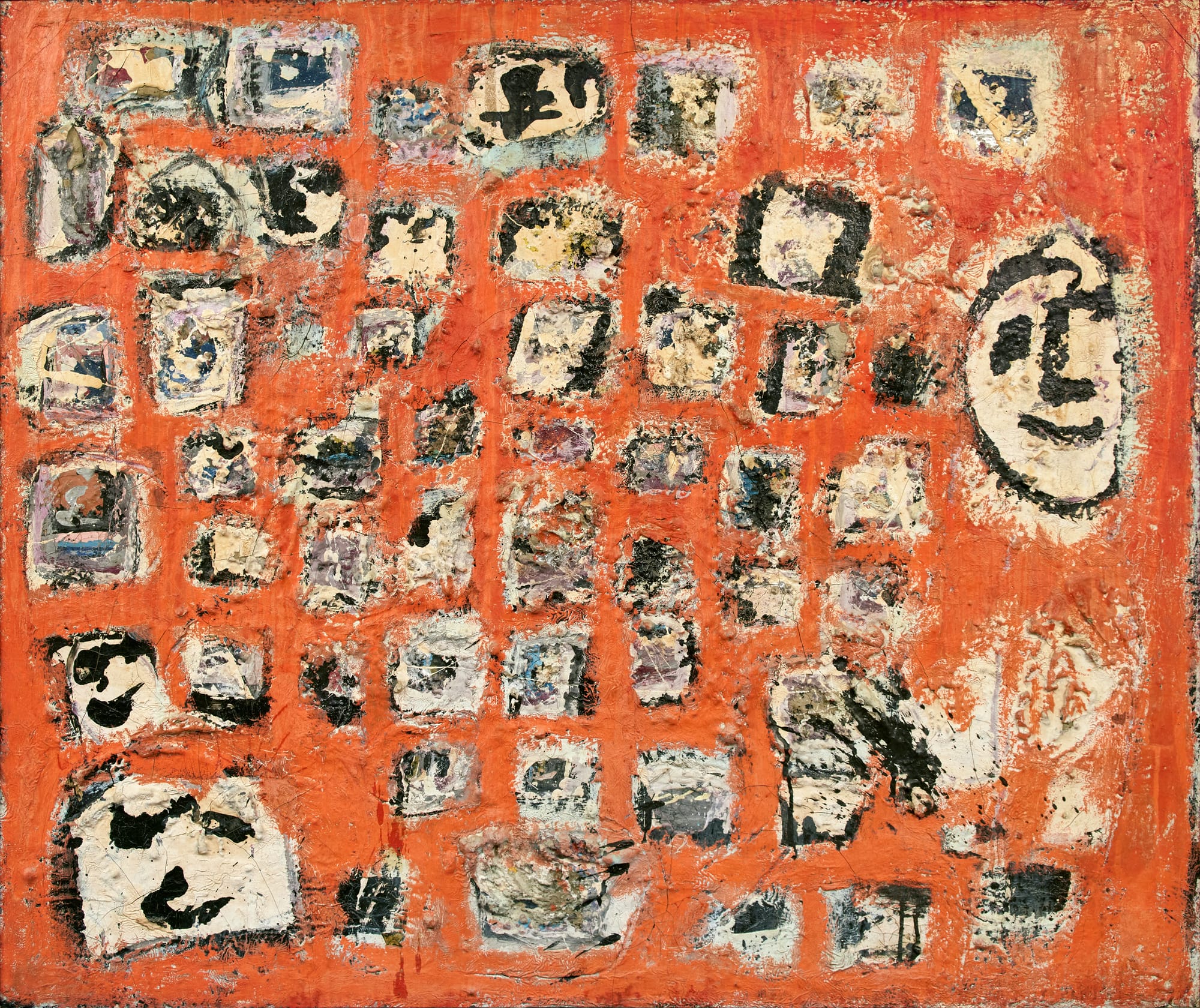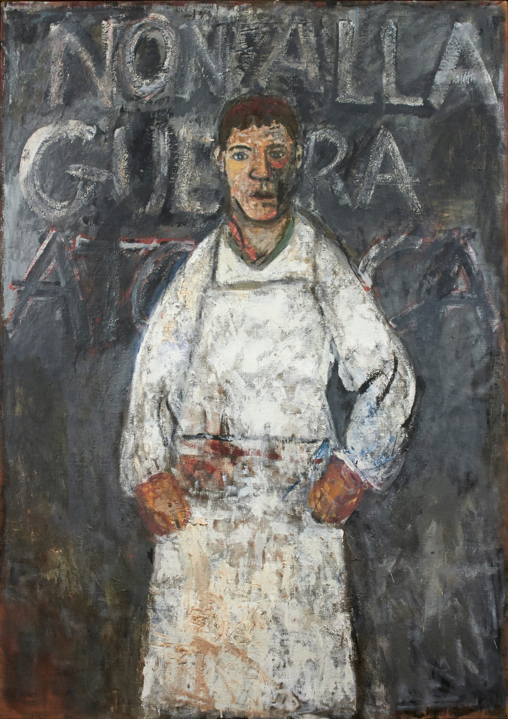In “Butcher Boy” (c. 1957), a young man in a bloody, stained apron stares directly at the viewer, looking somewhat stunned, with his mouth slightly open. He is not quite at ease. On the black wall behind him, in Italian, we can make the word “nonalla guerra” (not to the war). The work was painted during the early years of the Cold War and the testing of atom and hydrogen bombs, when both the United States and Soviet Union urged their citizens to take specific steps to survive a nuclear war. In retrospect, storing food and water in basements or building fallout shelters in backyards only heightened the general fear, as these precautions were likely ineffective.