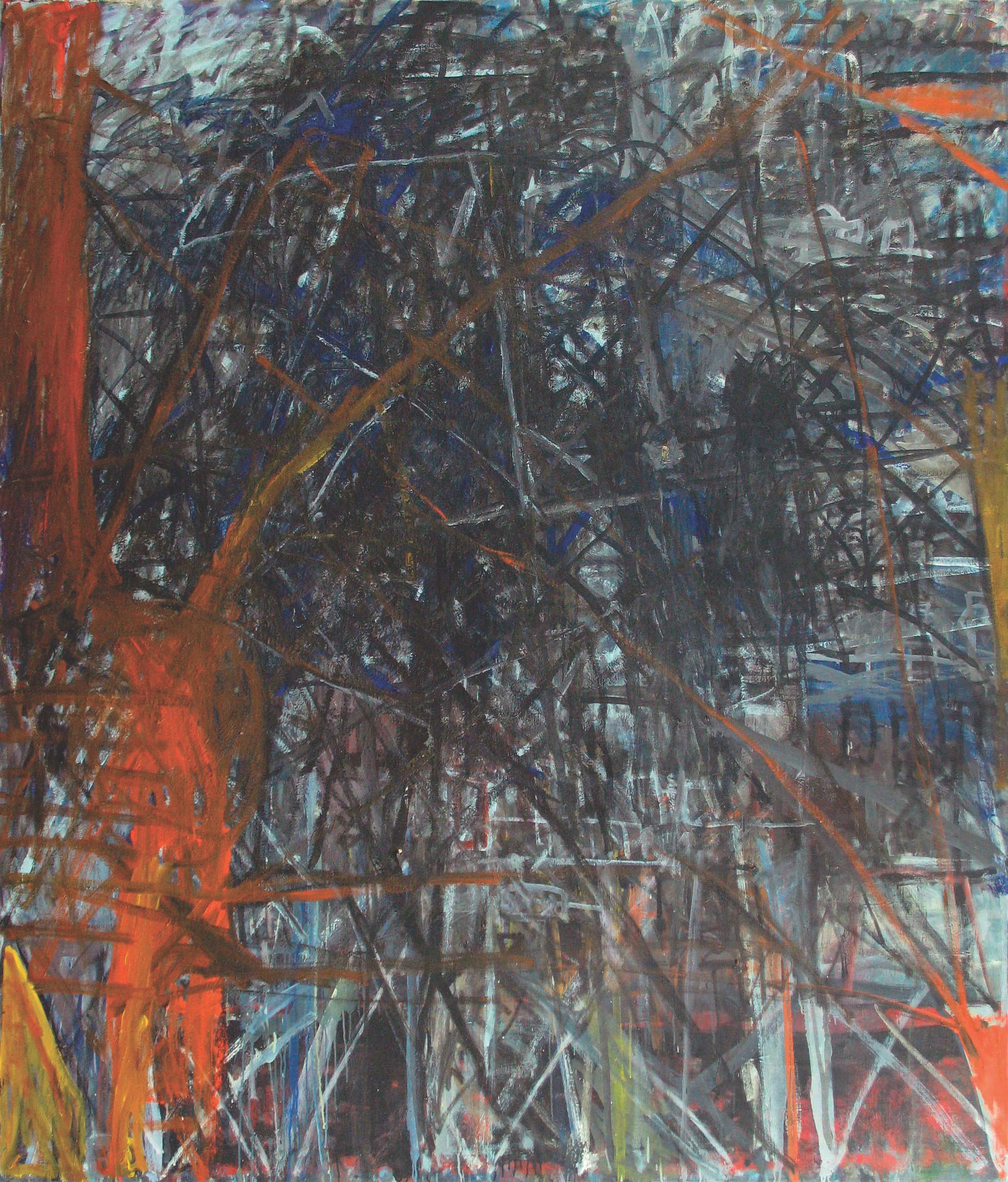 In the mixed media on paper “Birches” (c. 1968), the layers of lines to the right of the birch suggest scars, echoing the tree’s worked surface. That use of line as scar and obliteration reaches a fever pitch in an earlier painting, “City Anguish” (1958), as Brodie builds up a crisscrossing network of mostly dark gray and black lines. He is both crossing out and building up the surface, making a network of entangled X’s. His attention to similar marks, and, at the same time, the changes they go through because of his laborious, layered process evokes contradictory feelings of determination and frustration. That collision seems to be the artist’s response to the American Dream and the myth of equal opportunity. Brodie, who grew up in the bug infested, crowded tenements and immigrant population of the Lower East Side and got out of it, recognized that he never fully abandoned that world, nor would he forget the myriad impressions it left with him.