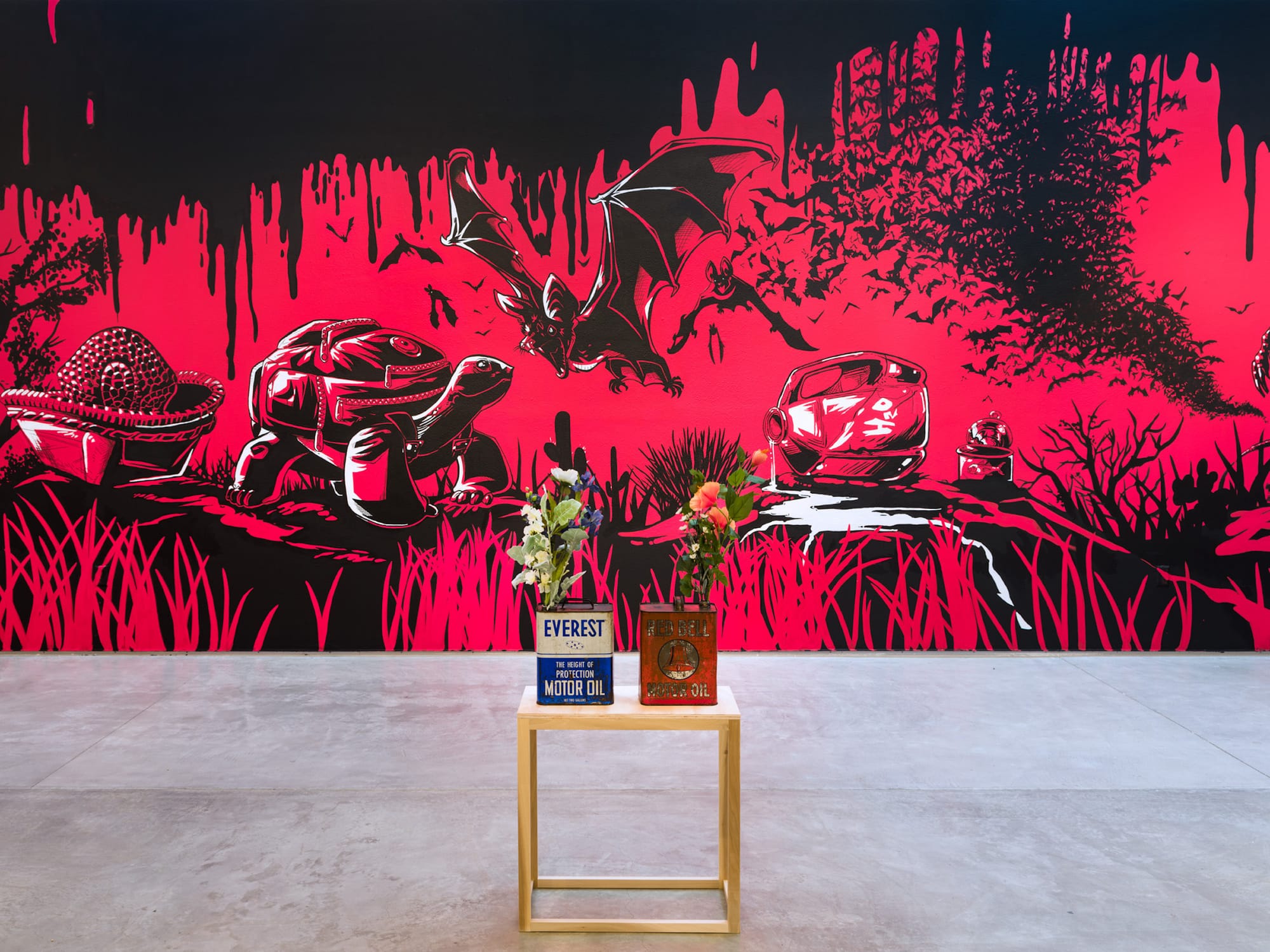 Following Mexican artist Minerva Cuevas’s artist residency during the springtime, the ICA San Diego presents a solo exhibition of the artist’s work focused on petroleum. Cuevas, known for her witty interdisciplinary works critiquing global production and consumption, makes a splash by covering the gallery walls in oil.