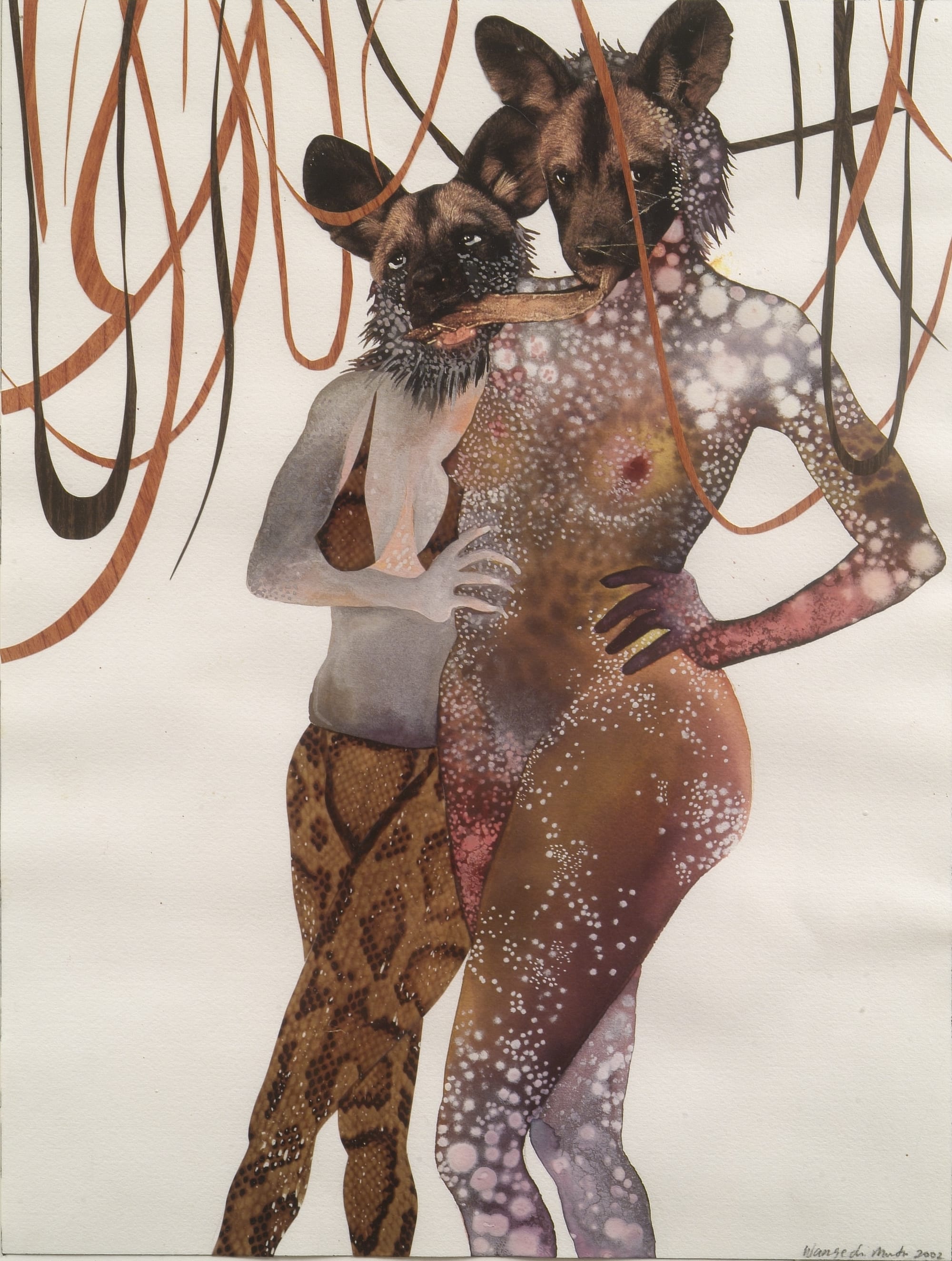 Intertwined is an invitation to get lost in Wangechi Mutu’s world. In her characteristic paintings and collages, androgynous creatures with sprawling wings, human-like figure with giant eyes and hyena ears and snake-patterned limbs, and nude women reposing languidly on tree trunks inhabit fantastic settings evocative of mystical roller discos. Her surfaces are built up of magazine cut-outs, glitter, shells, ink, and even soil, but these are almost impossible to identify; Mutu’s magic lies in her expert, seamless cohesion of disparate elements — and in her incisive criticism of the ways in which images of Black women are misrepresented and exploited. — VD