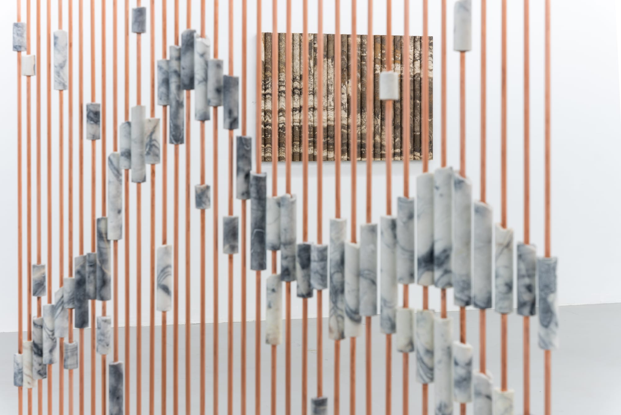 Elena Damiani's floor sculpture "Blind ll" (2022), the centerpiece of her exhibition, consists of 37 thin copper beams lined up on a marble plinth. Stone cylinders of varying sizes intercept the rods like beads on an abacus, placed at different heights so they create a vaguely recognizable image — a mountain range, perhaps, or the visual representation of sound waves. The piece, like others in the show, has an uncanny presence: Damiani’s use of stone conjures sedimentary layers, jagged edges, and other naturally occurring textural and visual phenomena, but the inclusion of inorganic materials reminds us of our human footprint. — VD