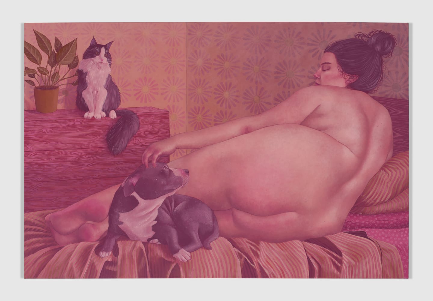 Spanning ten new paintings — all in earthy pink hues, as the exhibition's title suggests — and a 74-inch-long paper mâchée sculpture of a woman leaning back placidly in a bathtub, Shona McAndrew’s latest exhibition celebrates the indulgence of simply being. Several works portray the artist and her partner, adding another layer of intimacy to compositions like "Bedtime" (2023), a more relatable take on art history's ever-present reclining nude, or "Hold You" (2023), which captures the unique satisfaction of grabbing a handful of booty. Far from commodified, mediagenic expressions of so-called “self-care,” McAndrew's vision of rest is soft and compassionate. — VD