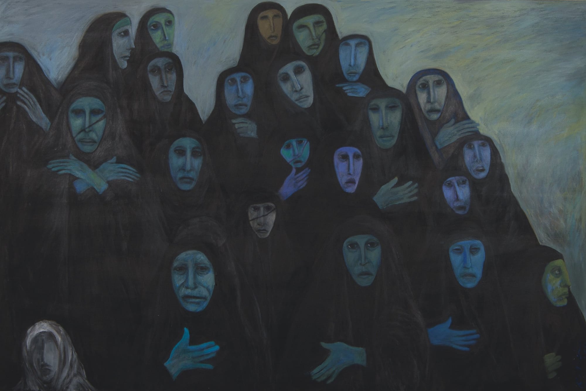 As a major figure of Arab Modernism, Morsi is a poet, painter, and critic from Alexandria, Egypt. After moving to New York in 1974, his signature portraits of stylized figures began to incorporate references to the sea, along with other recurrent symbols: fish out of water, mythical horses, and abstracted figures with almond-shaped eyes. “Weeping Women II” exchanges Picasso’s weeping woman for the collective faces of Iraqi women weeping for the loss of Arab lives and families at the hands of US-instigated wars. Morsi authored the first monograph in Arabic on Picasso.