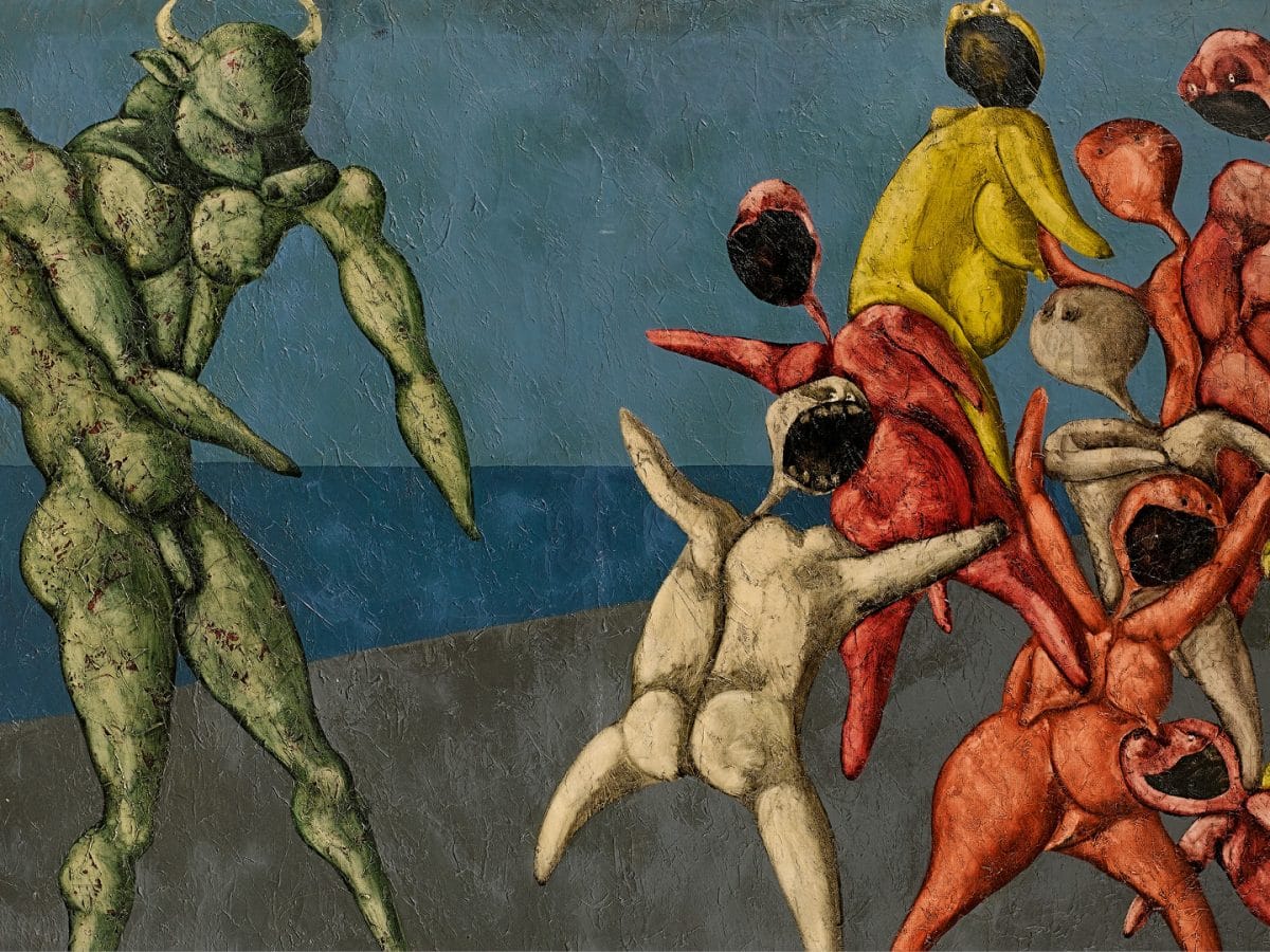 Nestled in Baya’s paintings are symbols of Algerian folk tales: Birds that transform into snakes and princesses that blur into river streams. Her gouache paintings of Algerian women, some portraying individuals, others pairs, are formed by curvilinear lines and bright colors that draw the viewer in. The Algerian artist (who often went by her first name) inspired the works of André Breton, Henri Matisse, and Picasso, and yet her work has rarely been shown alongside these major figures.