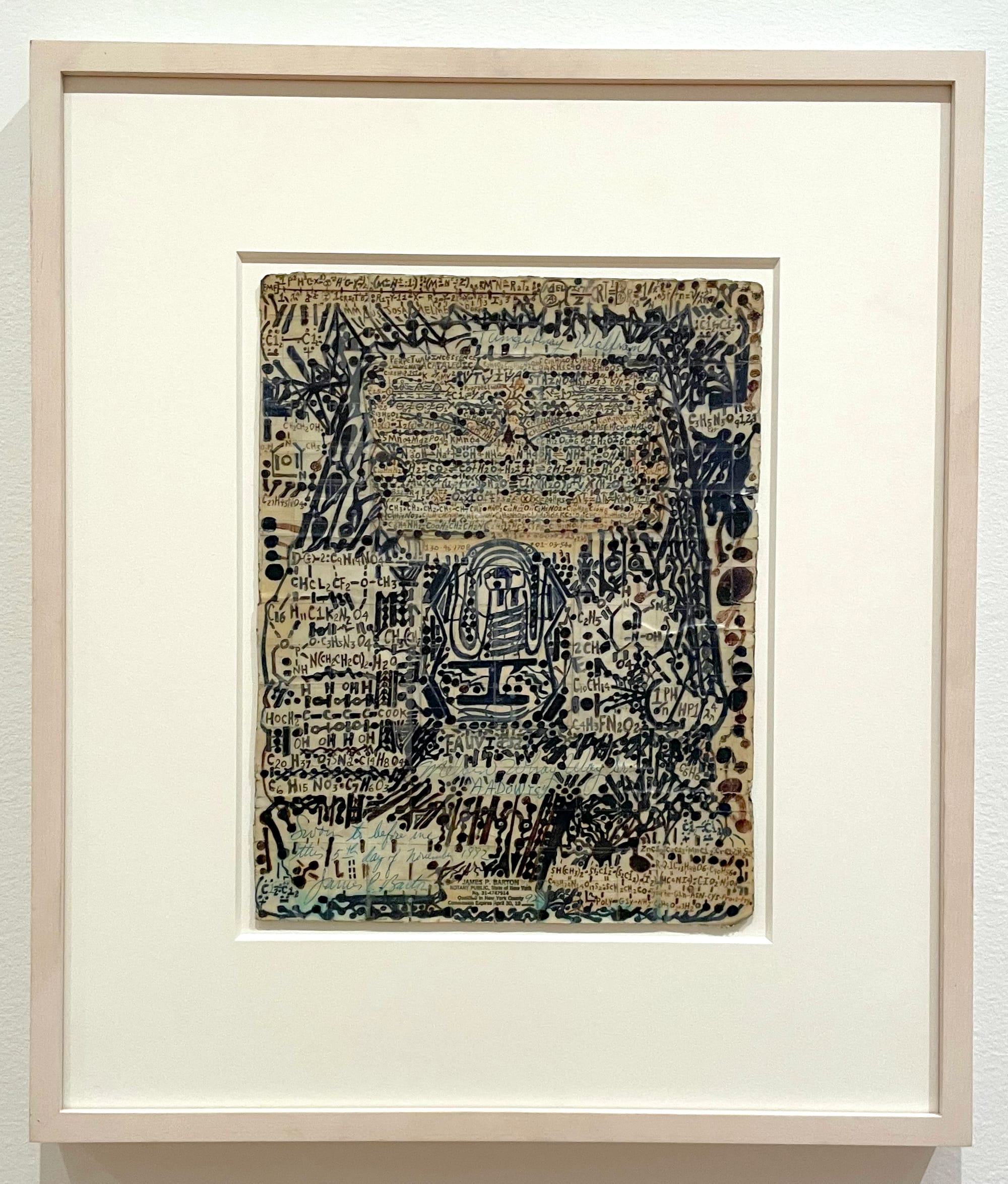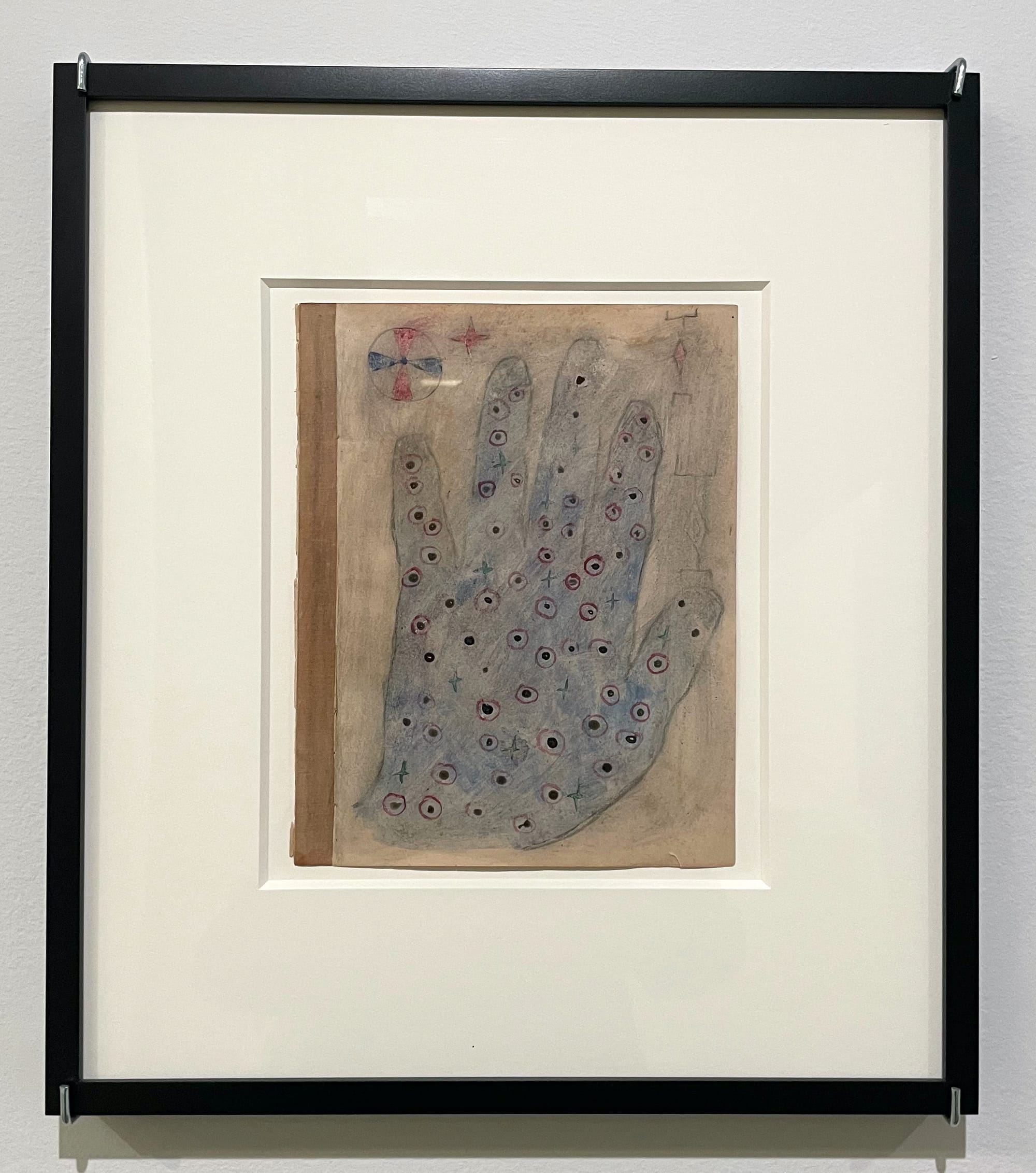 Other works range from visionary drawings, like a blue hand marked with circles by Hunkpapa Lakota artist He Nupa Wanica (Joseph No Two Horns), to scientific-looking diagrams to cerebral pieces that offer more name recognition than genuine interest, such as a dry painting of tiny arrows by Howardena Pindell and some insubstantial drawings by Isa Genzken and Sigmar Polke. A handful are gems, including David Weiss’s sketches of strange little creatures and outer space, and a drawing of a UFO trajectory attributed to M.A. Ulyashev (both from 1975). Yet not much demands attention, and several pieces require some explanation that would be best placed on wall texts alongside the art.