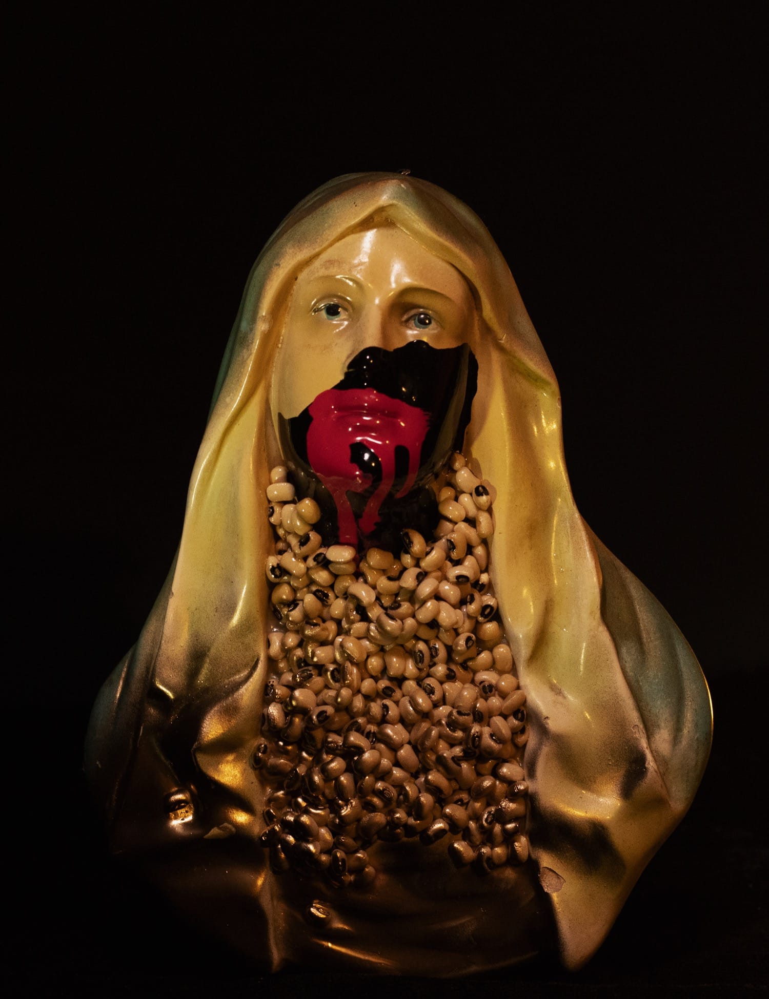 In its modern definition, desecrating is not merely the destruction or disrespect of sacred objects, but inherently the notion of also depriving them of their sacred character. However, the word “desecrate” comes from the Latin desecrare, meaning “to make holy” with the “de-” prefix meaning “from” or “concerning,” as opposed to undoing or being the opposite of. Arguably, Rave’s work does not de-sanctify the image of the Virgin, but re-sanctifies its symbolic nature by dismantling the long-term systematization of female holiness as purely White. With Mary in Blackface, drooling blood red paint, we are reminded of the complicated history of how art performs sanctity, and that the worship of holy idols and images — including Mary’s female body — does not only belong to a European Christian belief system.