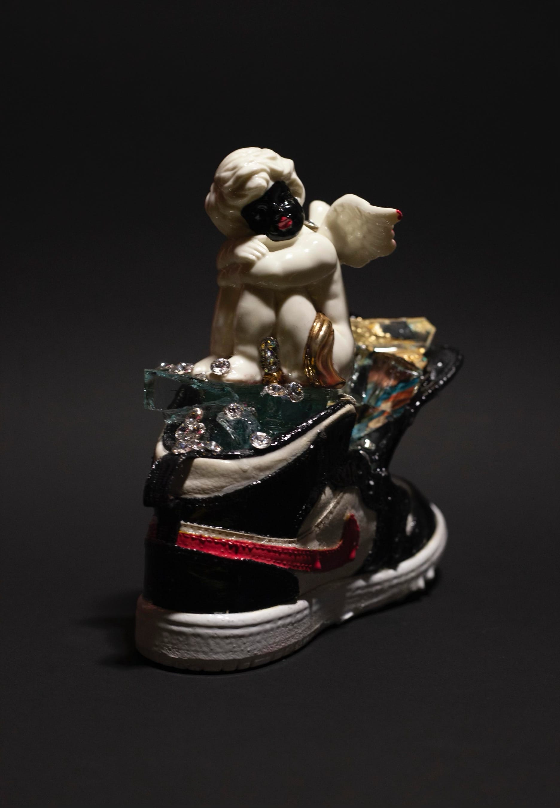Rave’s collection includes a series of white porcelain cherubs and other statues, busts, and figures of the Virgin Mary — all in Blackface. Some of these figurines are standalone pieces while others combine ephemeral images of the Mother with pornography of women in glass encasings. Some other works are assembled into larger craftings that include vestiges of brand name products: empty bottles of Hennessy, Newport menthol cigarette packs, baking soda boxes, the Nike emblem, a painted face of Colonel Sanders, and logos such as Gucci and Louis Vuitton.