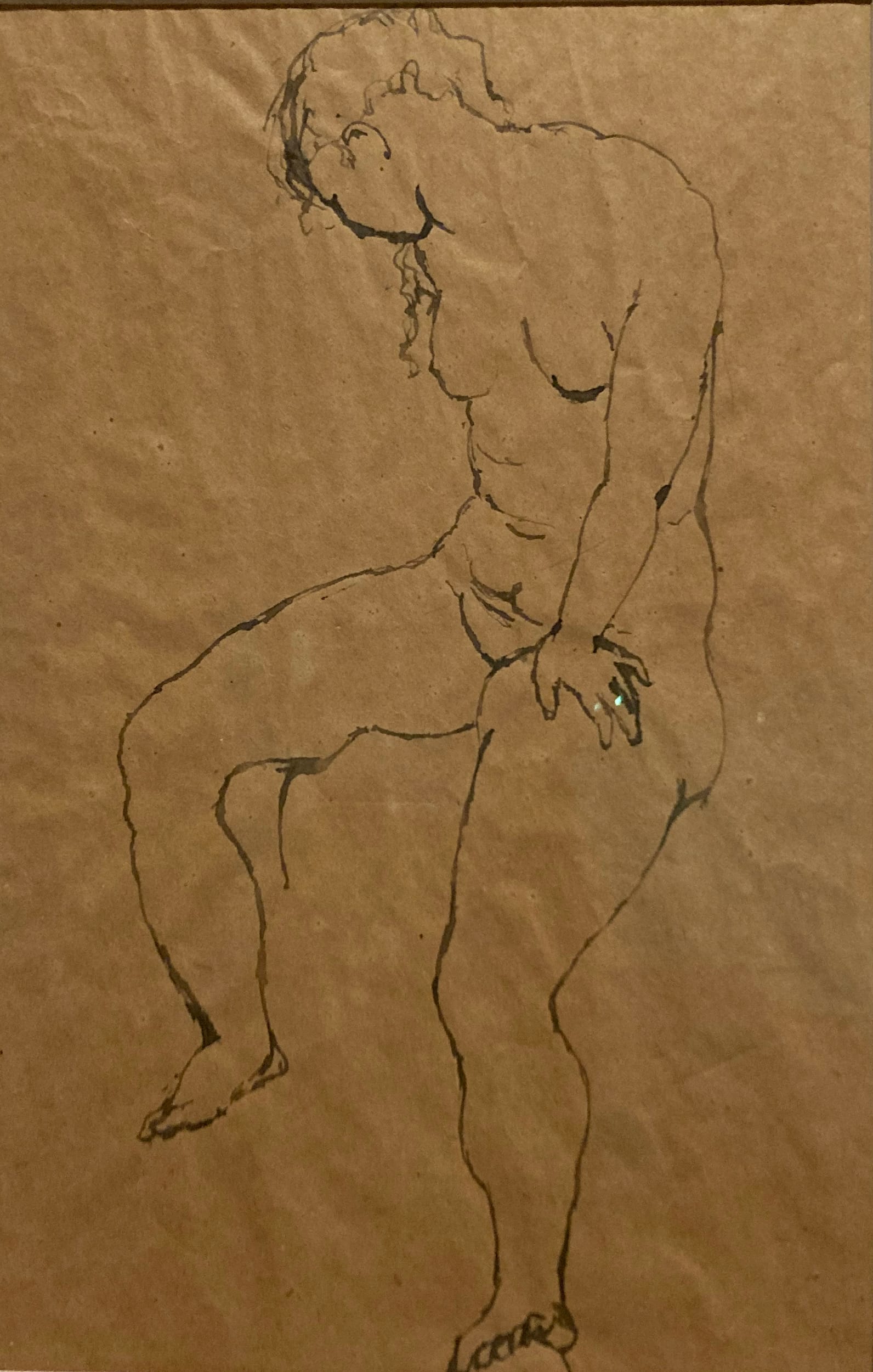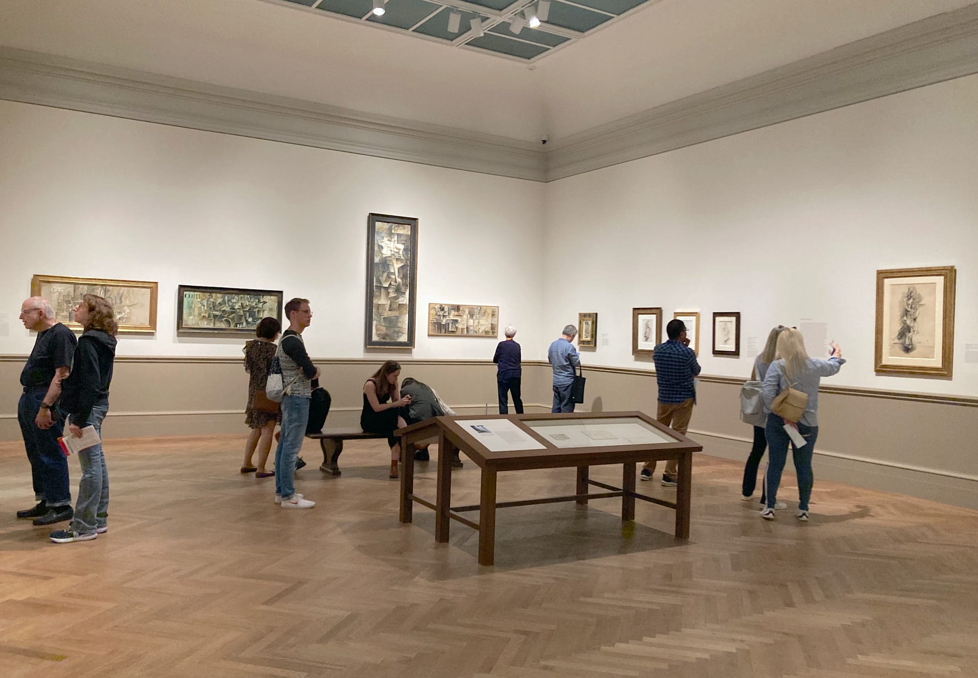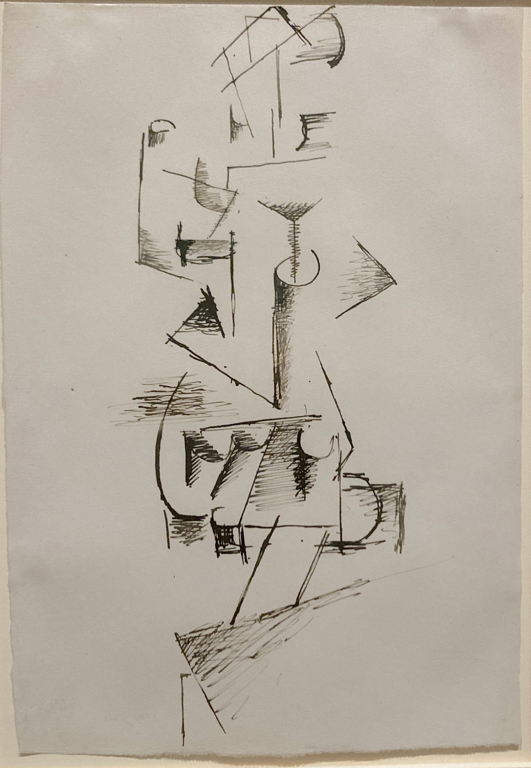 They’re beautiful textures, though, every shape rendered with subtle gradations of light and dark. I was more compelled by the sketches than the paintings, in particular a series of gorgeously sparse, geometric nudes drawn in the summer of 1910, while Picasso was planning his response to the commission. These ink-on-paper drawings could be seen as forming a bridge between the more naturalistic figurative work he made in the early 1900s (represented here by a 1904–5 sketch of a nude woman that Field also owned) and the Cubist paintings he produced for the commission. But the show makes no attempt to draw a thread between these works. They’re hung far apart, and the gallery text emphasizes their differences, rather than their shared desire to distill the subject down to its barest essence, to make depth and motion with a simple line.