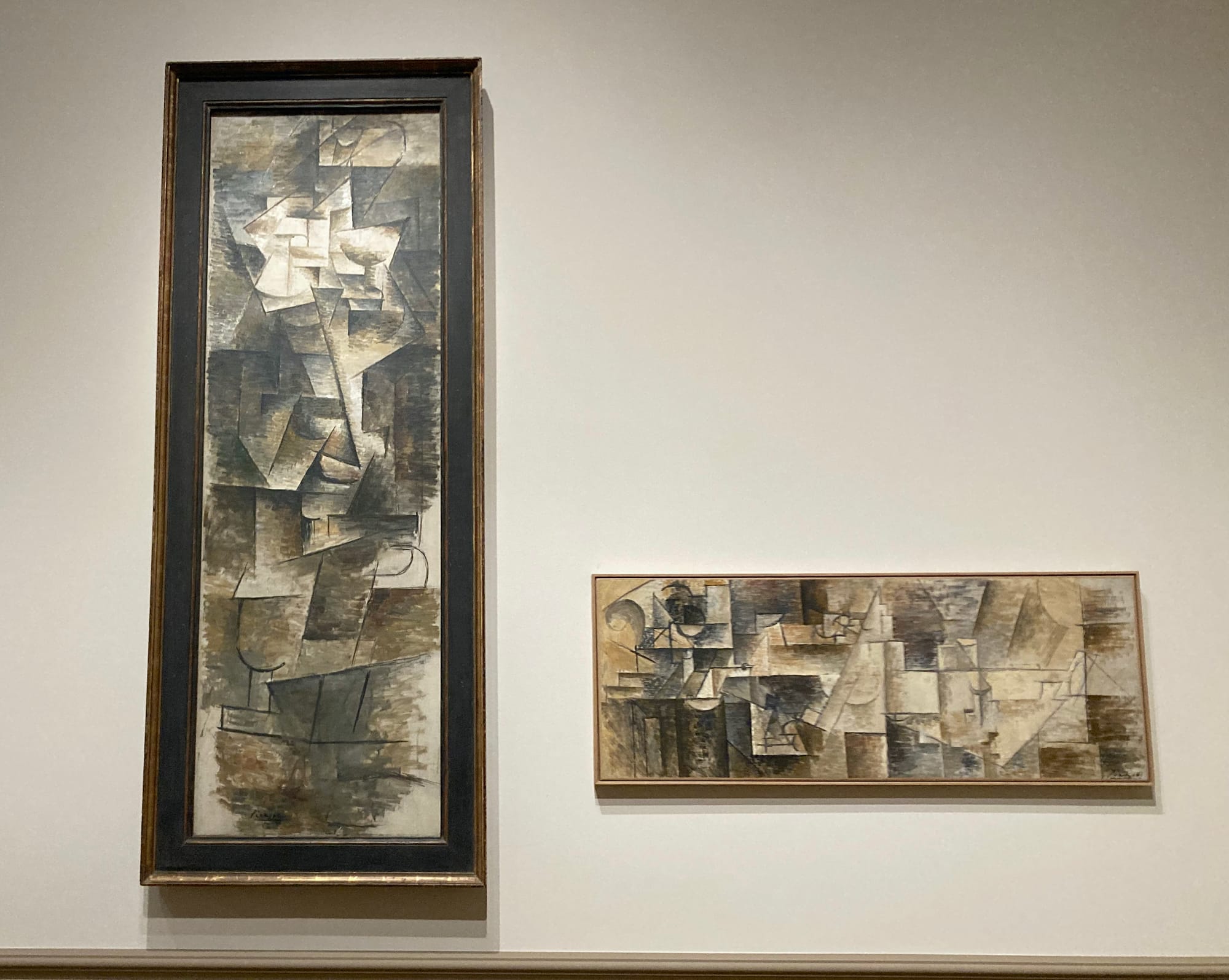Field’s home is now destroyed — he lived in the slice of Brooklyn Heights that was flattened by the Brooklyn-Queens Expressway — so there would be no way to see the works in situ even if the commission had been completed. The library space that he intended the paintings to fill was a tight three by seven meters, far smaller than their exhibition space at the Met. Few of the works are hung at the level Field intended, which raises other questions. How did Picasso work on these pieces? Can we know if he used easels at eye level, or if he considered the angles from which they would be seen? How do the paintings change when they are positioned above a doorway, rather than at the Met’s standard mid-wall level? The fragmented forms and blended perspectives that define Picasso’s early Cubist works imbue these paintings with a level of visual complexity; they appear simultaneously flat and full of depth. What would be the experience of seeing them from below, or fit into the tight corners of Field’s library? A few photographs on view show these paintings in Picasso’s studio, but the reproductions are so small it’s hard to recognize anything. One digital rendering depicts how “Pipe Rack and Still Life” could have been located above a doorway, but again it’s hard to get a real sense of how the painting would look from that angle.