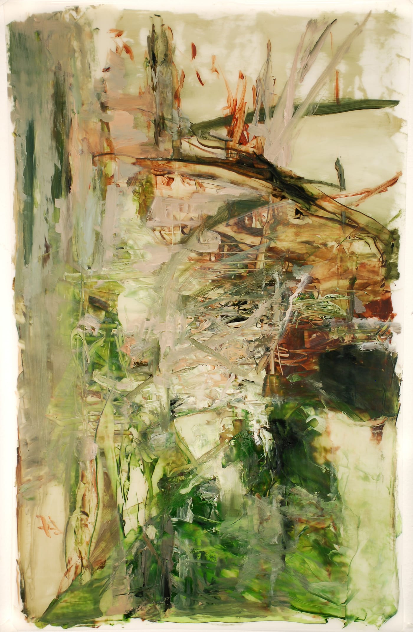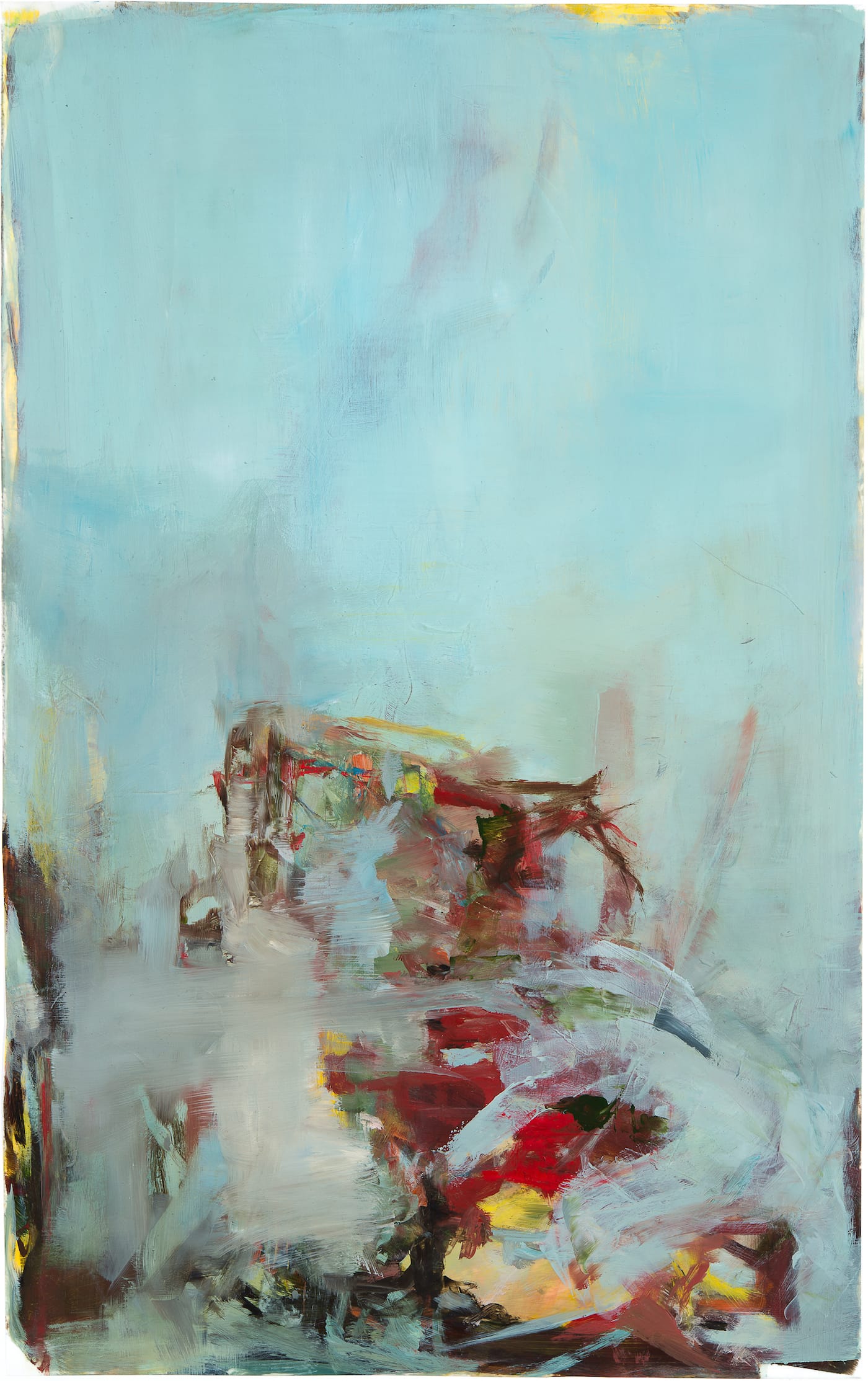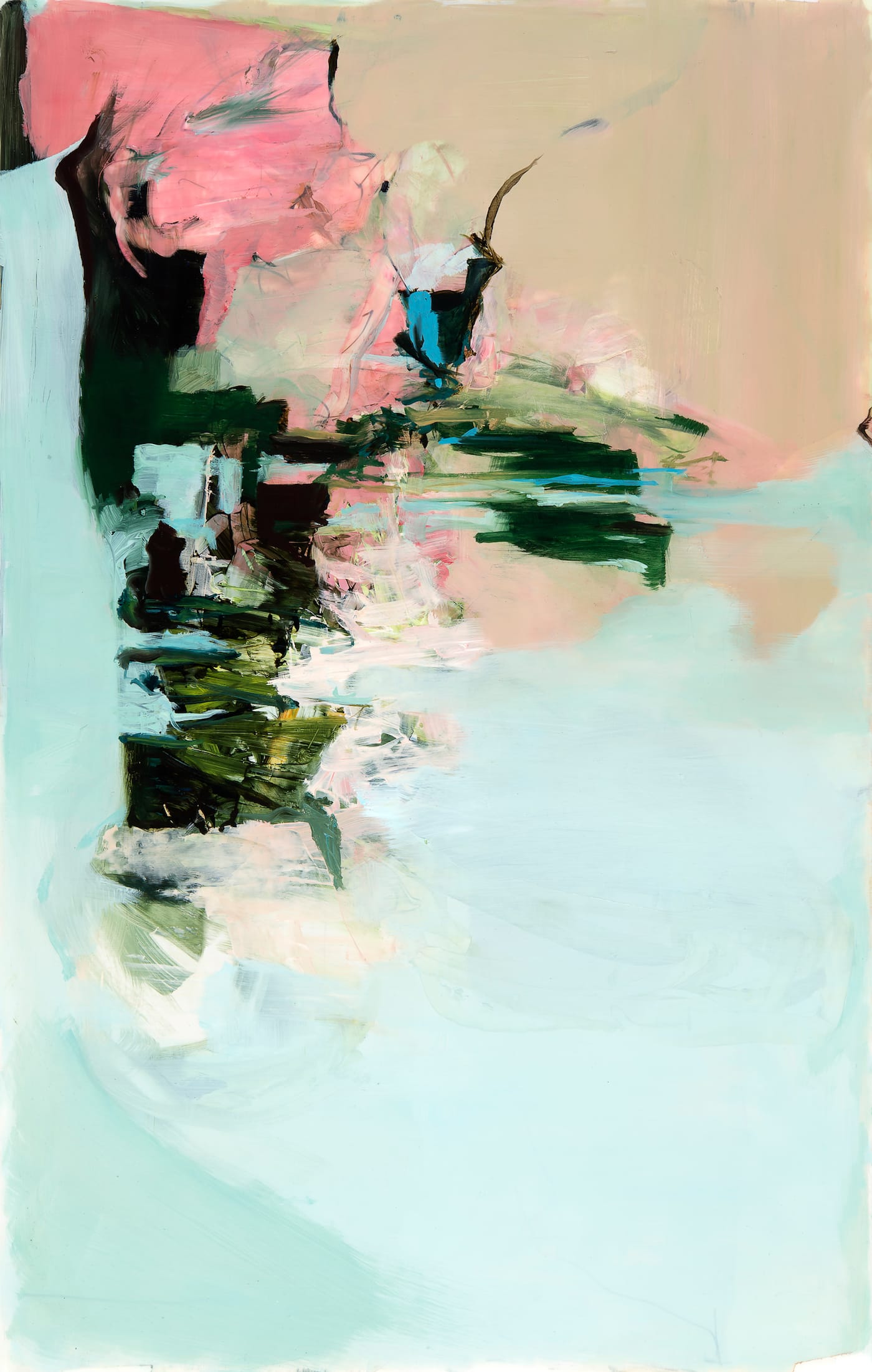 Evan Fugazzi, a painter and assistant director of Gross McCleaf, mentioned to me that Heichemer started some of these paintings in New Hampshire, where she works part of the year. Sometimes she would leave the painting there for months before returning to it. Other times, she would bring the work back to her studio in Philadelphia.