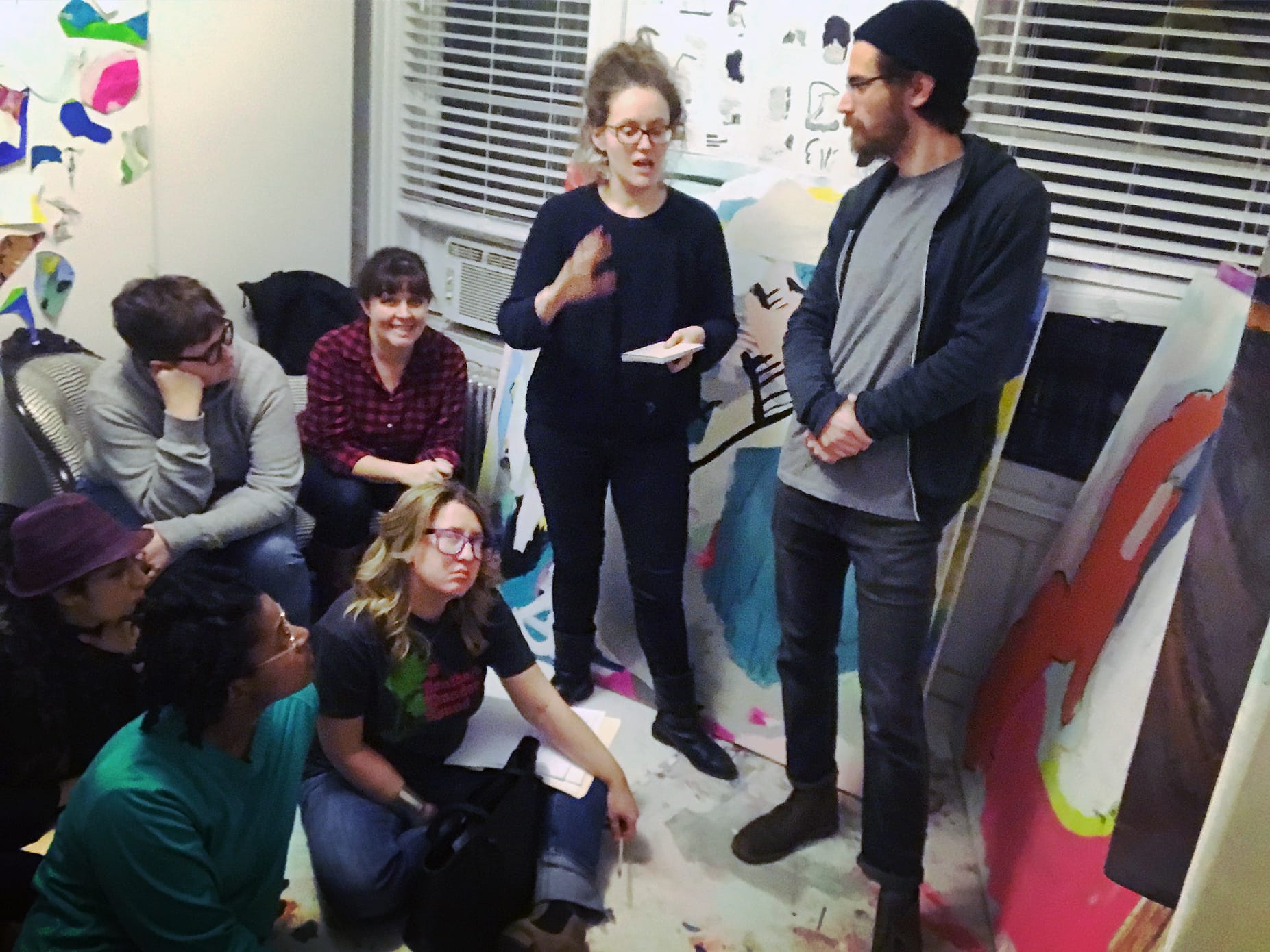 Haggarty and Doyle describe NYC Crit Club as “a grad school-style class where participants meet in person for group critique in different studios and spaces in the New York area each week.” To participate, artists submit an application, and each crit class costs $20 ($25 for critiques with invited guests). Although the focus is on in-person critiques, Haggarty and Doyle recognize the limitations of access. “Online exchanges such as Art Prof’s videos and critique advice can reach artists anywhere,” said Haggarty and Doyle. “To reach artists outside the city, NYC Crit Club is starting to offer independent studies and portfolio reviews, which have the option to be done partially or entirely online.”
