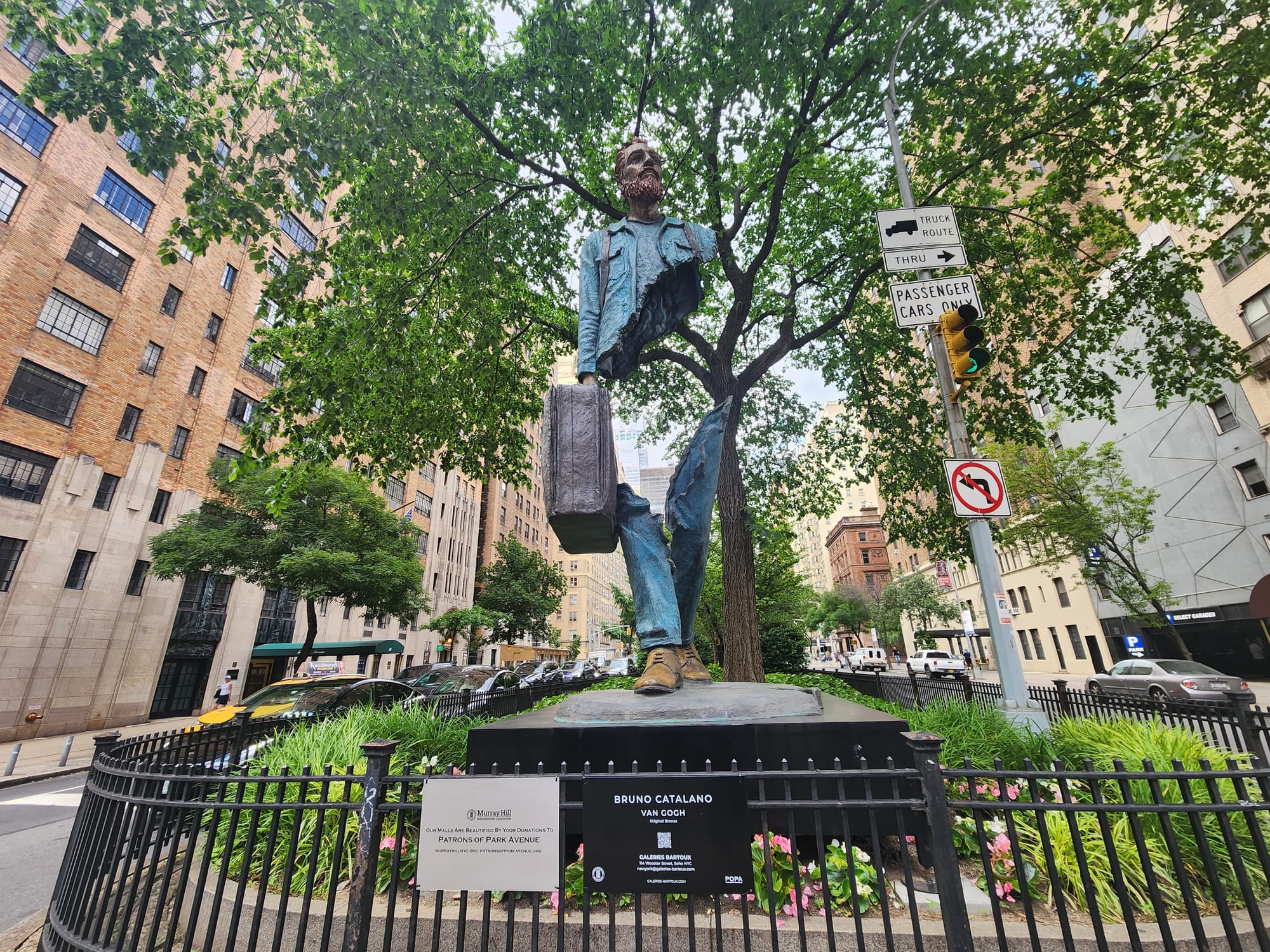 Though positioning the sculptures as arrivals or departures from the train station is no-brainer, Catalano's Travelers aren't the easiest to access, let alone appreciate, as they stand on the narrow botanical strips that divide the crosswalk along the avenue. At most, I witnessed a single person stop to take a photo of the sculpture at the 36th Street crosswalk whereas everyone else couldn't be bothered to take a second glance. There's neither much time to be spent as the crosswalk timer ticks down from 20 seconds, nor do the sculptures necessarily stand out despite towering in height, as their neutral tones and matte finishes are washed out by the plant life behind them.