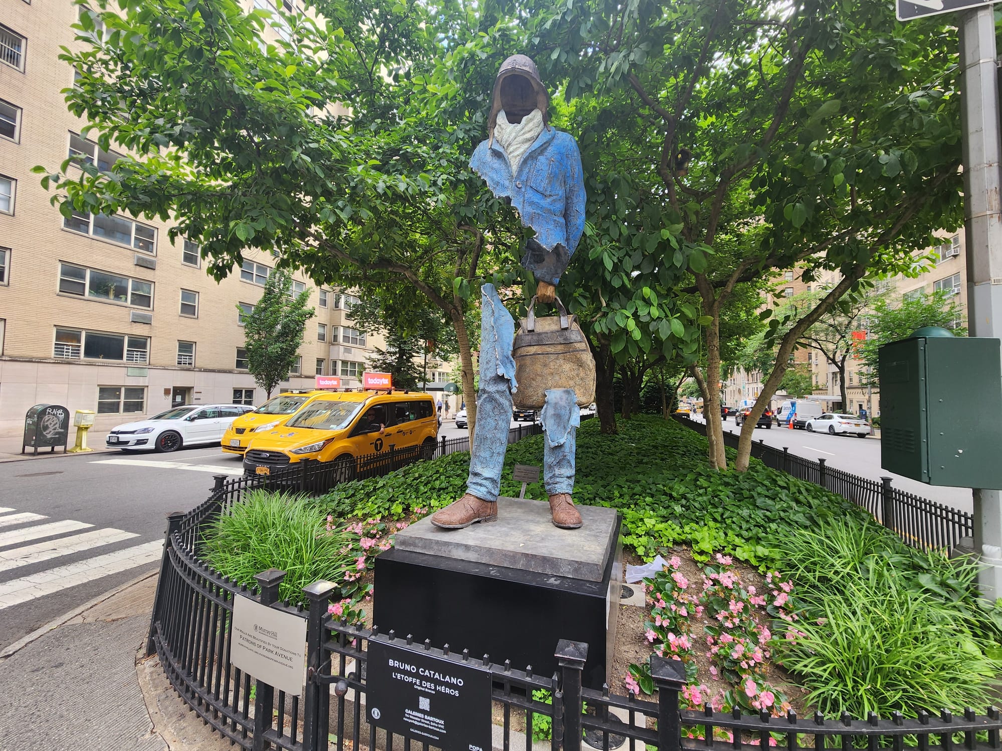 Between 34th Street and 38th Street along Manhattan's Park Avenue, several cast-bronze figurative sculptures are nested in the leafy malls between crosswalks, looking as bizarrely unconcerned about their missing body parts and hollow stature as they are about their heavy baggage. In a devastatingly hyper-literal interpretation of loss that appears to be made with the eraser tool on Microsoft Paint, the French-Sicilian artist Bruno Catalano's nine Travelers will remain installed in Murray Hill until May 2025 as the third-ever installation orchestrated by the Patrons of Park Avenue.