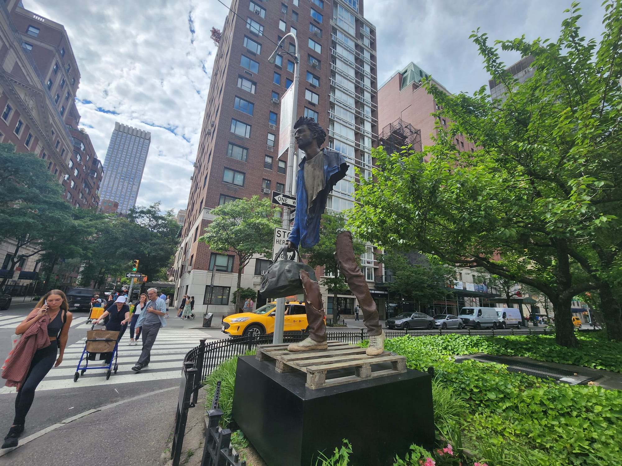 One could argue that that's precisely the point, as many people of the diaspora keep their heads down and their struggles private, going to lengths not to stick out while adjusting to their new terrain. But if we're talking about projection, I don't see even a shred of my father, a person who has moved over 30 times across three continents throughout his life, in any of these nondescript men in slacks and sneakers. (On that note, I'd probably be singing a much different tune if just one of them was clad in unfortunately familiar neon yellow spandex sportswear, or a belt that may or may not be a luggage strap, but I digress ...) The Park Avenue installation doesn't even feature any of Catalano's sculptures of the women and children from his broader Travelers series. How am I supposed to empathize with my immigrant mom when every sculpture is the epitome of Just Some Guy?