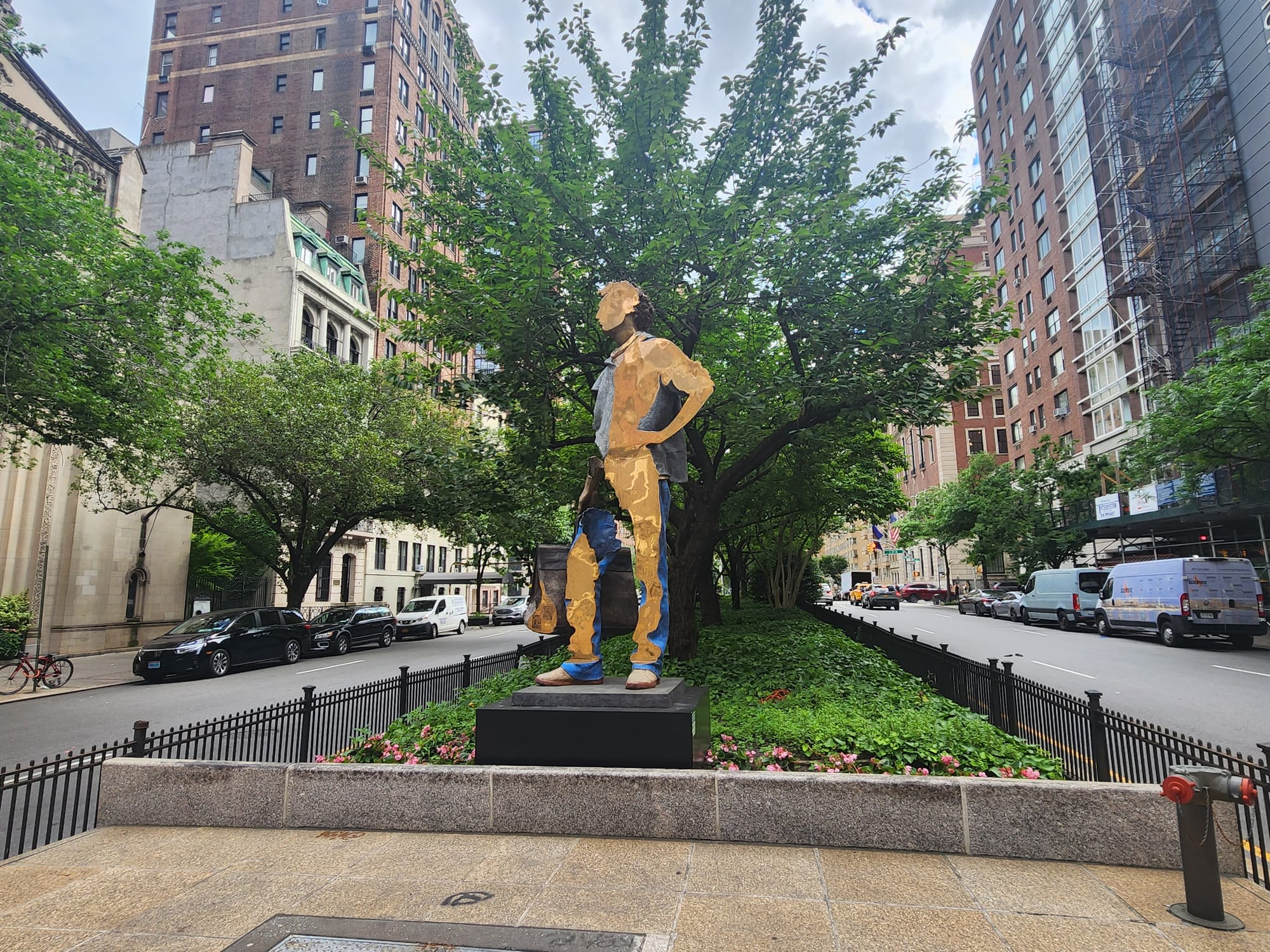 Just south of Grand Central Station and saddled with hand luggage, Catalano's Travelers put forth a heavy-handed message about immigration and its rupturing impacts on identity, purpose, and connections with the world. Catalano himself migrated from Morocco to France as a child, evidently reflecting on his and his family's experiences of leaving things behind while navigating forward. Each of the bronze voyagers is on an unspecified journey with the prospect of accepting the unknown etched onto their faces.