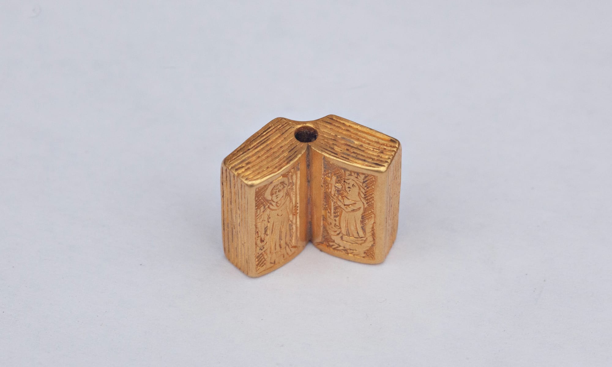 The fact that readers generally have a sense of what “the Bible” is provides no excuse to use the term without cause. There’s no evidence at all that this bead is intended to represent a Bible. English goldsmiths engraved a lot of words into jewelry this size, and would have engraved In principio (the famous “in the beginning” from the Gospel of John), or other well-known scriptural text onto the volume if they had wanted it to be identified as a Bible.