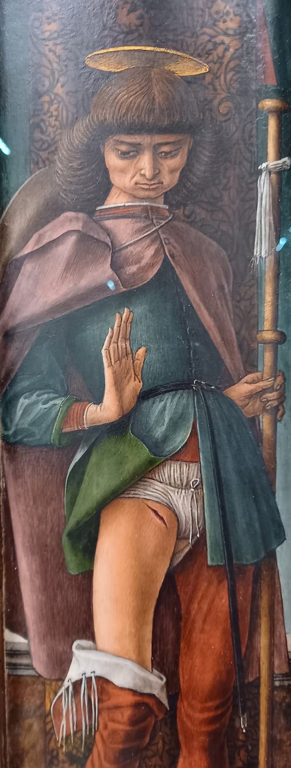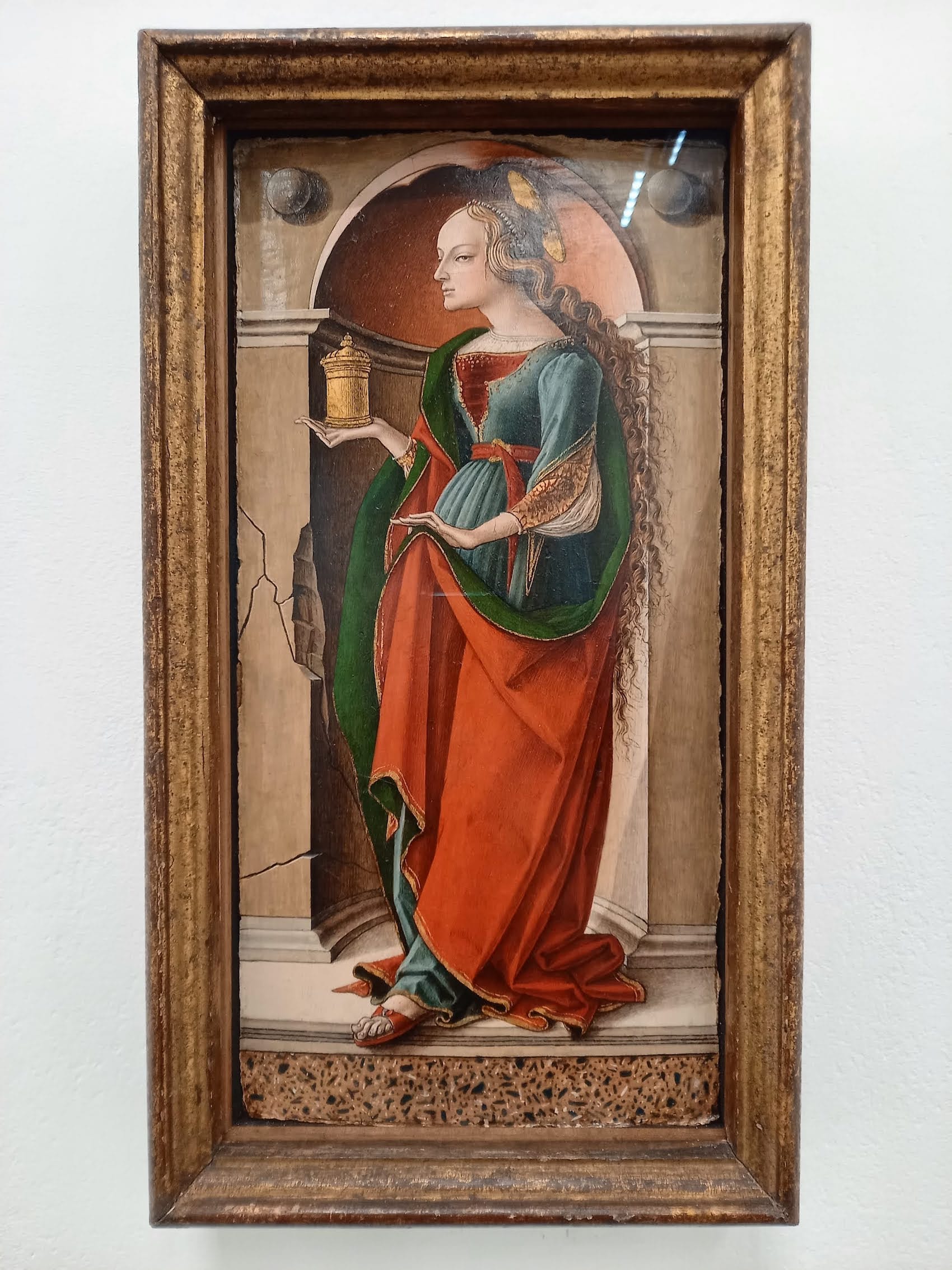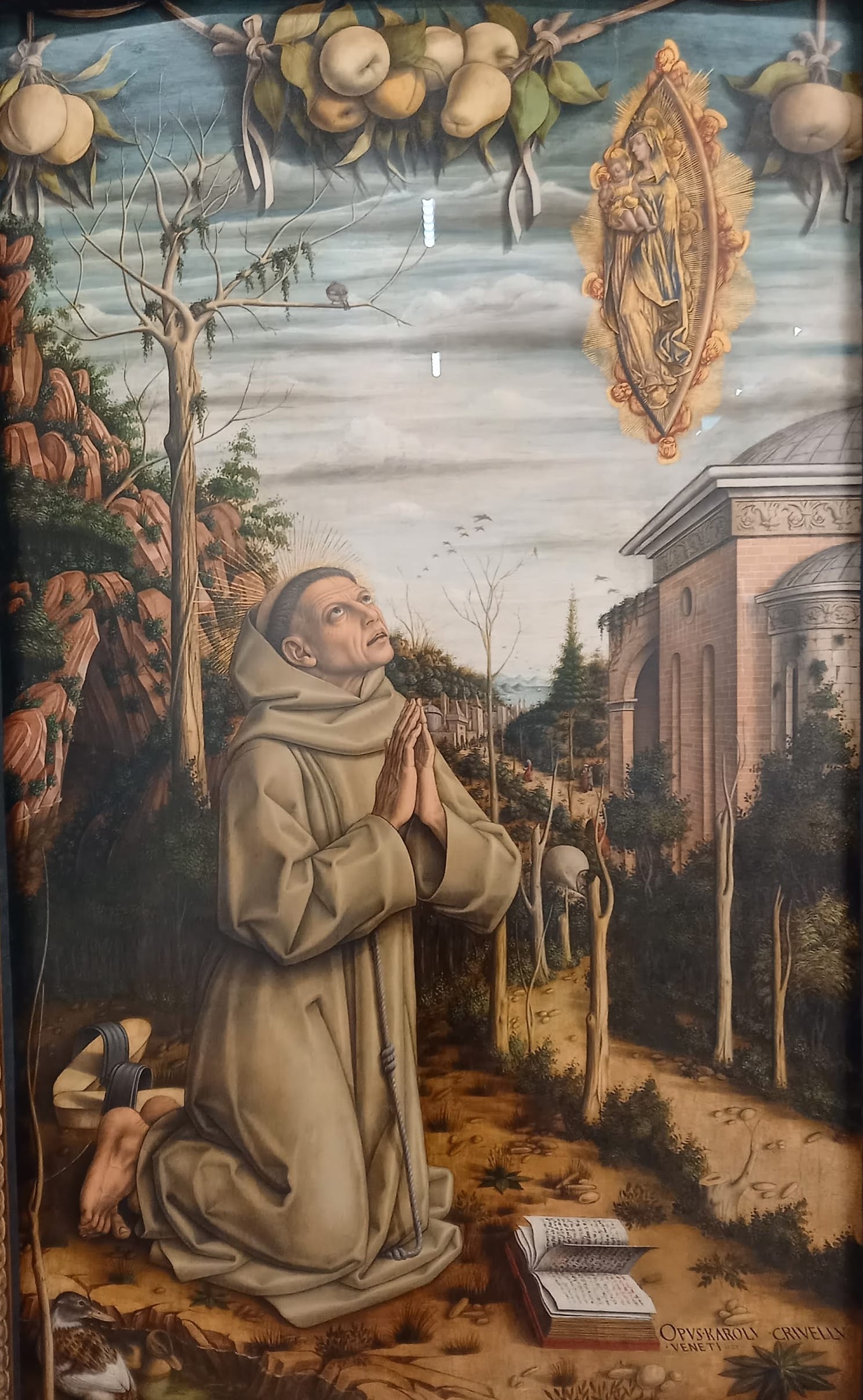 On a superficial level, the presentation is exactly like you might imagine from a contemporary gallery tasked with hanging and promoting historic artworks: nine Crivelli paintings, seven from the UK and two from the Gemäldegalerie, Berlin, and the Vatican, hang on bare white walls, a la the fabled white cube. The show is renamed Shadows on the Sky, which replaces the 15th Century bit with something more contemporary sounding, and the press release has some absolute howlers of contemporary art-speak: “Shadows on the Sky highlights his experimental use of perspective, trompe l’oeil (optical illusion) and sculptural relief to create illusions of illusionism” and “such cleverness was conveyed with consummate craftsmanship and foiled by an extraordinary elegance.”