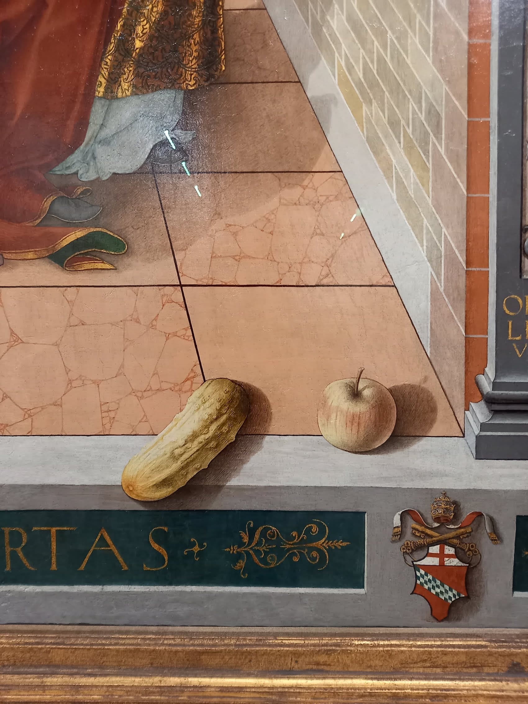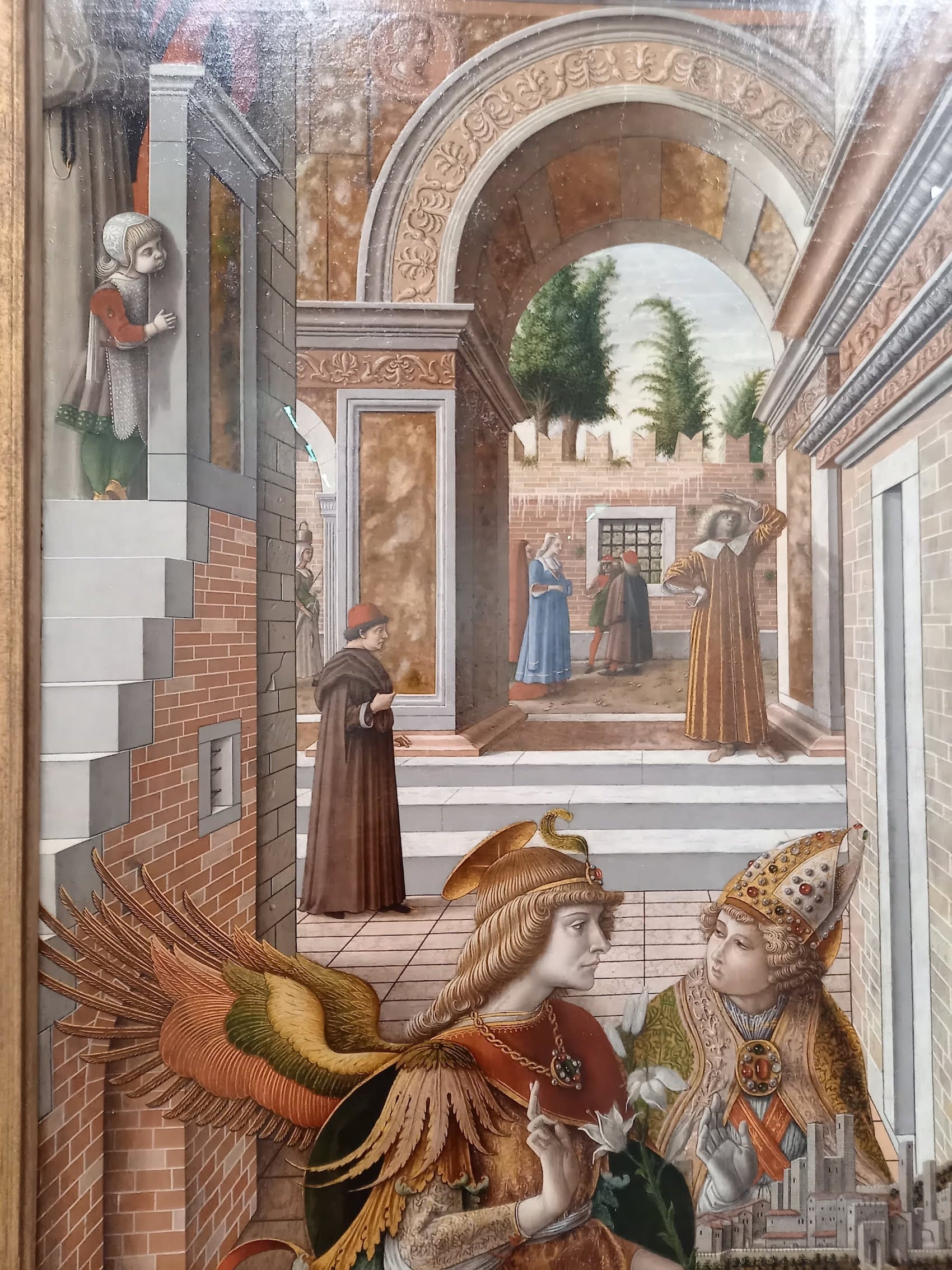 The exhibition guide tells us that Crivelli was born c. 1430 and worked in his hometown of Venice until he was brought to trial for committing adultery; upon serving his jail sentence he settled in the Marche region of eastern Italy. It draws our attention to Crivelli’s “pictorial play” and “complex visual systems and the metaphysical worlds which signal a reality beyond our immediate senses.” The technique of single-point perspective is consistently applied in the nine paintings, creating the illusion of a three-dimensional frame “behind” the picture plane, which is populated with saints and religious figures. Additionally, several trompe l’oeil tropes recur. Figures’ feet repeatedly protrude “out” of the picture plane toward us; flora and fauna, like flies or carnations, and bunches of fruit have drop shadows to give the impression that they are sitting “atop” the picture plane; Crivelli often paints cracks in marble or granite, occasionally with a stone fragment emerging "toward” us. In case of the "Annunciation, with Saint Emidius" (1486, National Gallery, London) the pictorial depth achieved by single-point perspective receding far back into the picture plane is bisected by a gilded line across the plane’s surface. In this case, the “cutting through” of the receded space signals the interplay between the divine, heavenly realm and our earthly "physical" one.