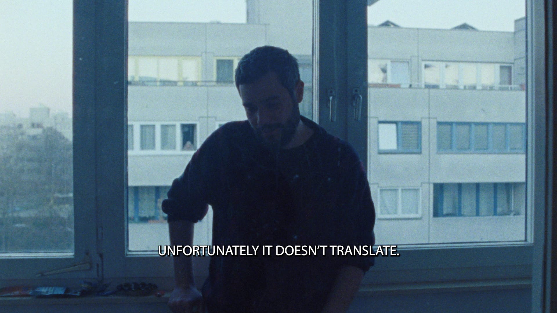 Set in a gloomy present-day Berlin, “Morgenkreis” is devoid of the histrionic romance imbued in the city by Wings of Desire. While Wenders frames Berlin through monuments and contemplative aerial viewpoints — church towers, columns, libraries, spaces of historical memory, and transcendence — al-Sharif’s grounded gaze, set to a slowed-down rendition of the Al Jazeera theme music, moves through constricted inhospitable spaces: the backseat of a car, a housing complex, the ascetic bureaucratic interiors designed to manage and control certain populations.