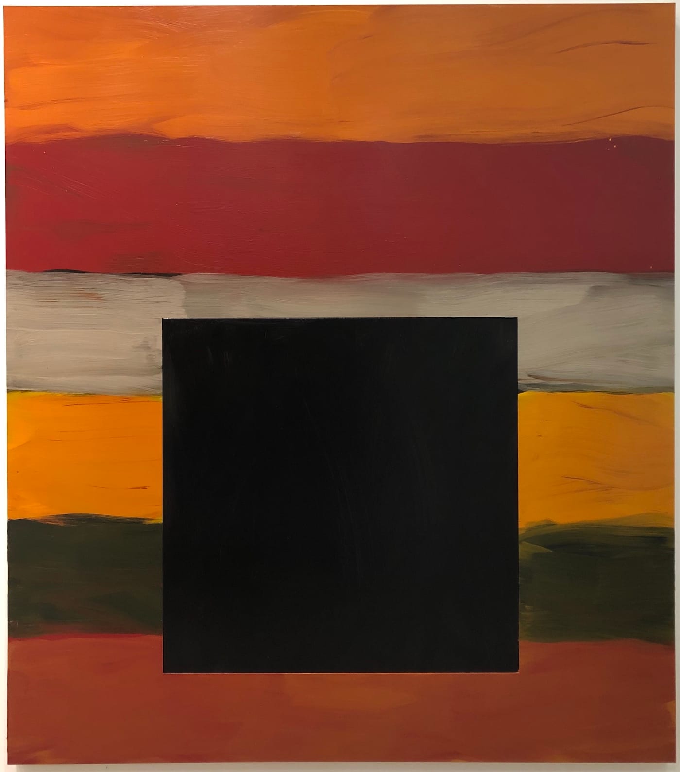 A new painting, “Black Square” (2020), consists, on first glance, of a Landline with a large square inserted into its lower center. But there’s more to this work, which is a little complicated. In the context of Scully’s career, adding this square constitutes a richly suggestive development.