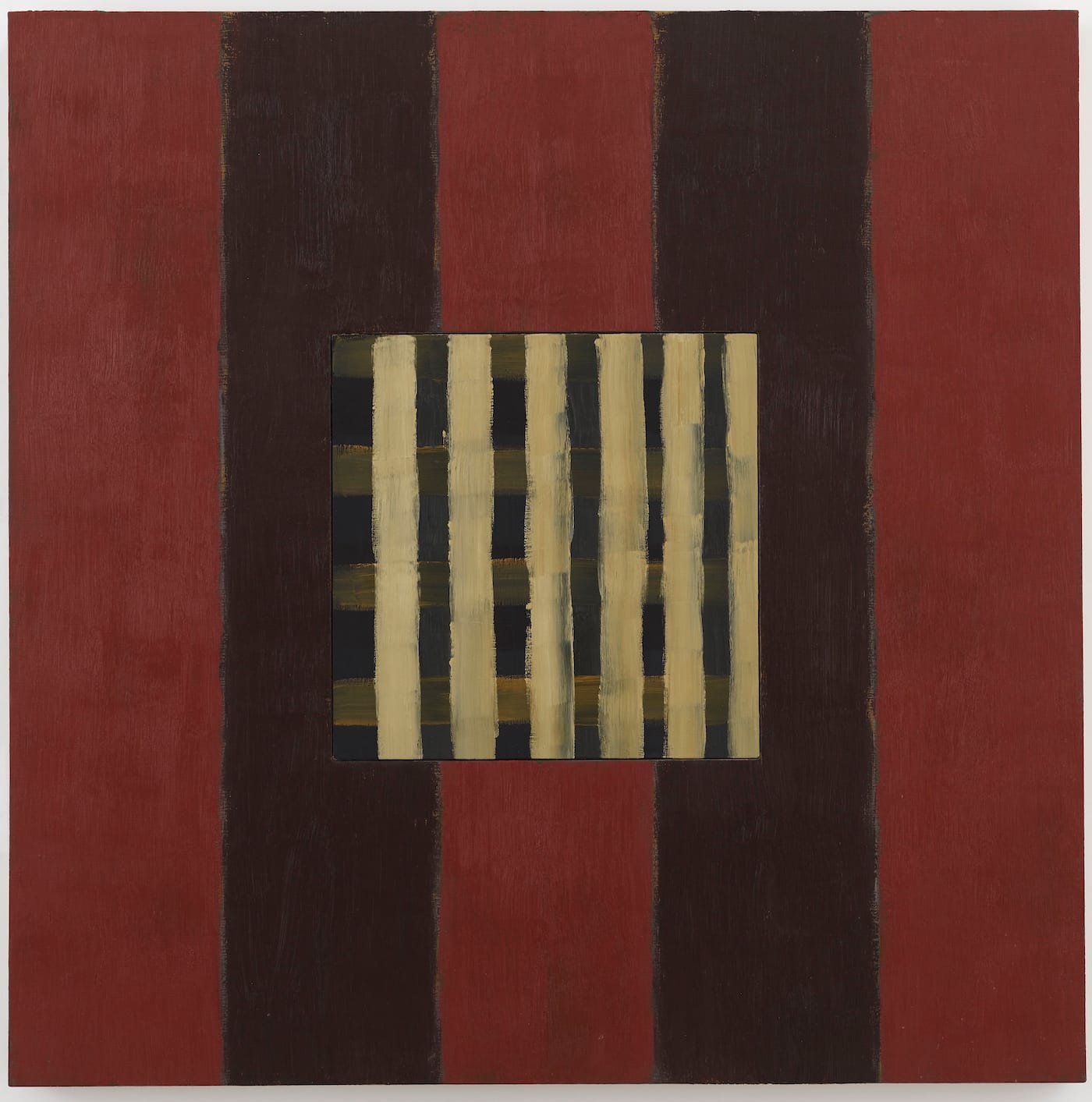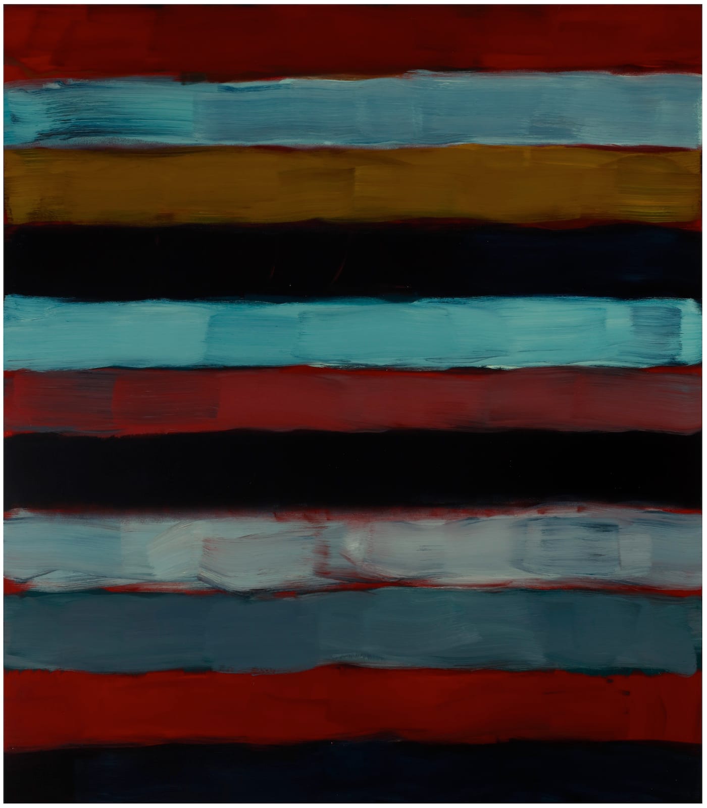 Windows in figurative pictures can open up the depicted room to the out of doors. Caspar David Friedrich shows figures looking out of opened windows, dramatically extending the confined interior space. Scully’s earliest grids from the late 1970s employ narrow horizontal stripes. Then in the 1980s, the windows he inserted in his paintings broke up the otherwise relentless fields of stripes, opening up those pictures abstractly. Now, however, his solid black window has a distinctly different spiritual significance.