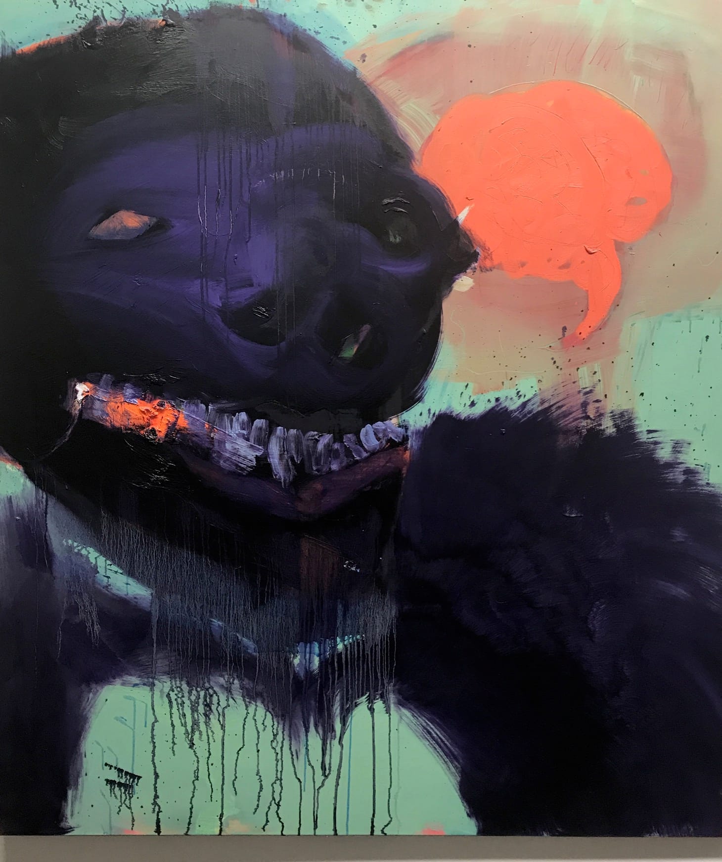 A handful of artists like Henriette Grahnert, Vivian Greven, Sebastian Gögel, Aneta Kajzer, Monika Michalko, Anna Nero, and Kristina Schuldt deviate from this path and venture into representational painting, while acknowledging their flirtations with abstraction. For example, the subject of Aneta Kajzer’s “I’ve Got No Brain Baby” (2017) is a humanoid creature with animal traits: large, inflated nostrils without any nasal bone, exposed teeth that are interrupted by a bright red area — like fresh blood in the corner of its mouth — and brush strokes that evoke fur. It is an inherently violent and captivating painting, where drips and splashes do not serve a purely process-driven purpose. These marks stem from an abstract visual vocabulary, but Kajzer brings them in dialogue with her ferocious sitter. Together, they form a frayed unity and lay bare the pleasure of looking at a painting that bursts at its seams.