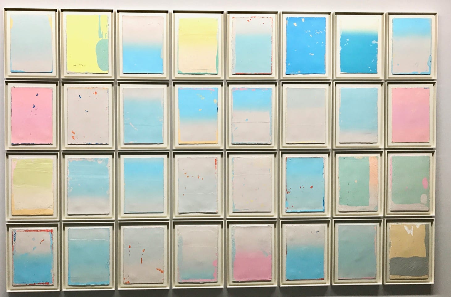 In this context, it is ironic that one of the few artists who goes against the curatorial dogma delivers one of the strongest works in the Chemnitz show. Franziska Holstein’s installation “Ohne Titel (32)” consists of 32 small paintings arranged in a grid. Holstein presents a visual symphony in which no individual piece gets drowned out by another. Her installation is a carefully orchestrated arrangement abuzz with color, tonal shifts, endless variations, and considered improvisations. Though the work is composed of vertical pieces, Holstein opted to install her work horizontally. This makes it a real stand-out within this almost-all-vertical exhibition.