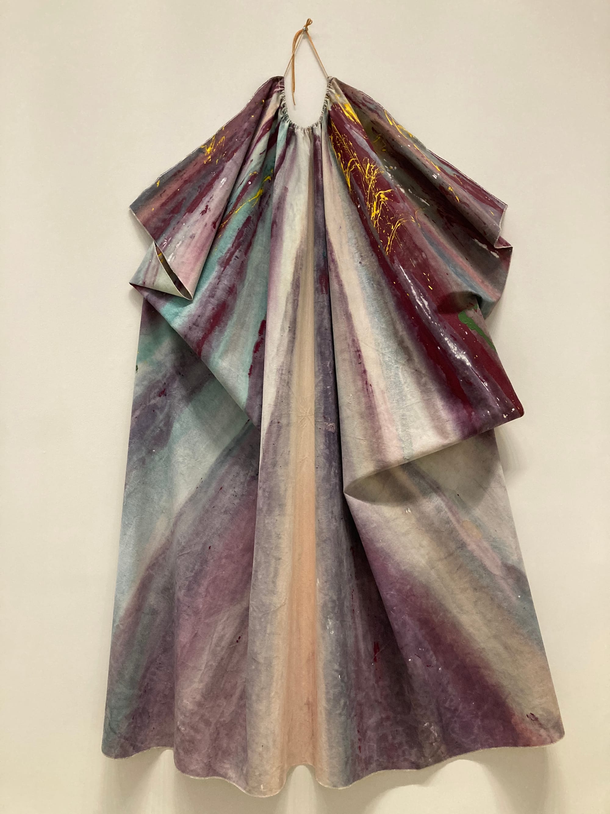The canvas hangs from a screw and some twine. These simple pieces of hardware are not focal points, but they define the structure of the work, allowing its patterns and washed-out colors to overlap in the soft folds of the canvas. Strengthened by its originality, “Dakar I" feels grand, as if it were cut from theater curtains.