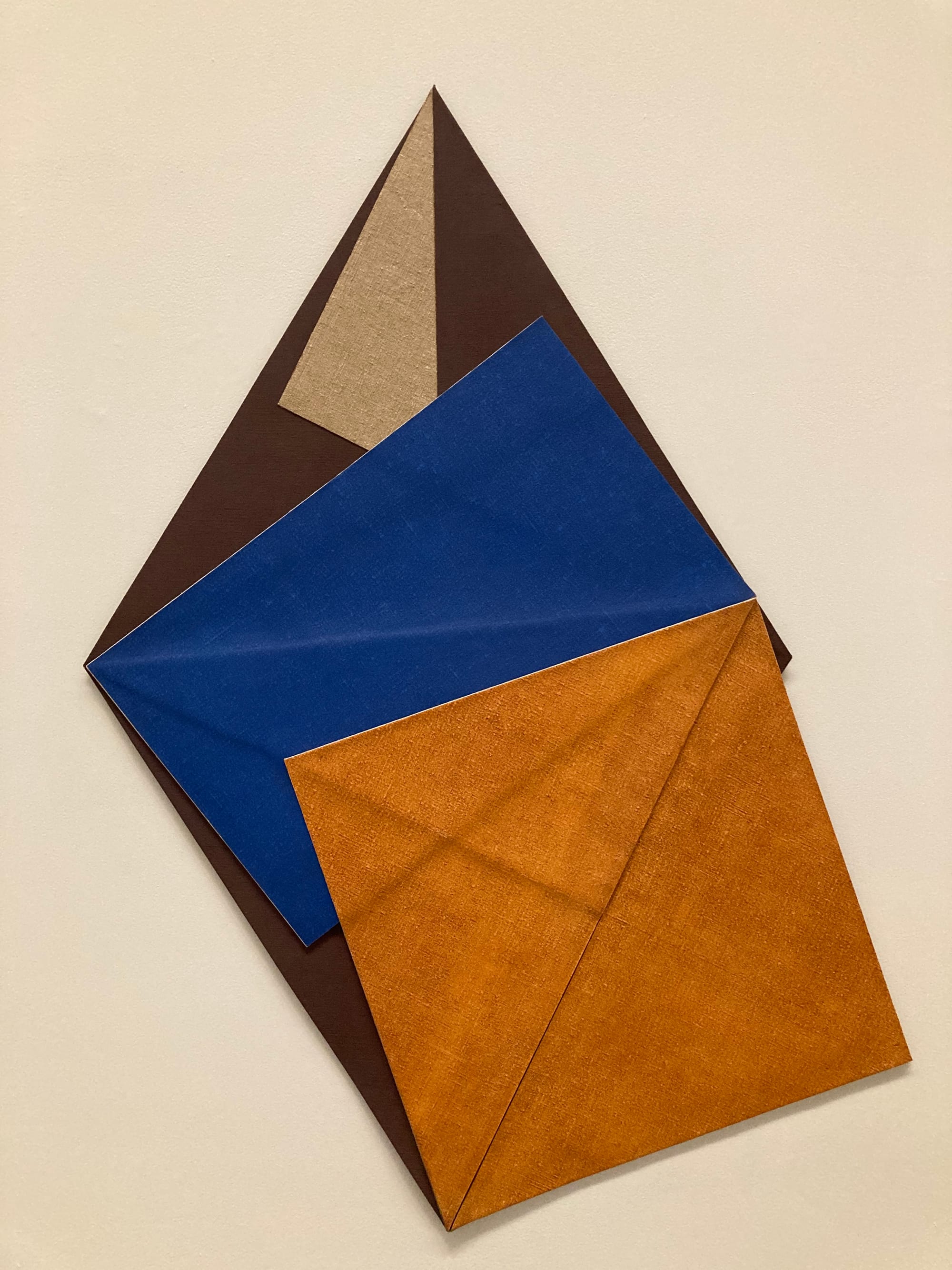In contrast, Dorothea Rockburne’s “Robe Series, The Descent” (1976), displayed on the same wall, feels placid. The work (part of a series) takes inspiration from the folds in the clothes of figures in Italian Renaissance paintings. While she uses some traditional materials, like oil and gesso, she rejects the standard rectangular canvas, instead layering canvases to produce sharp angles.