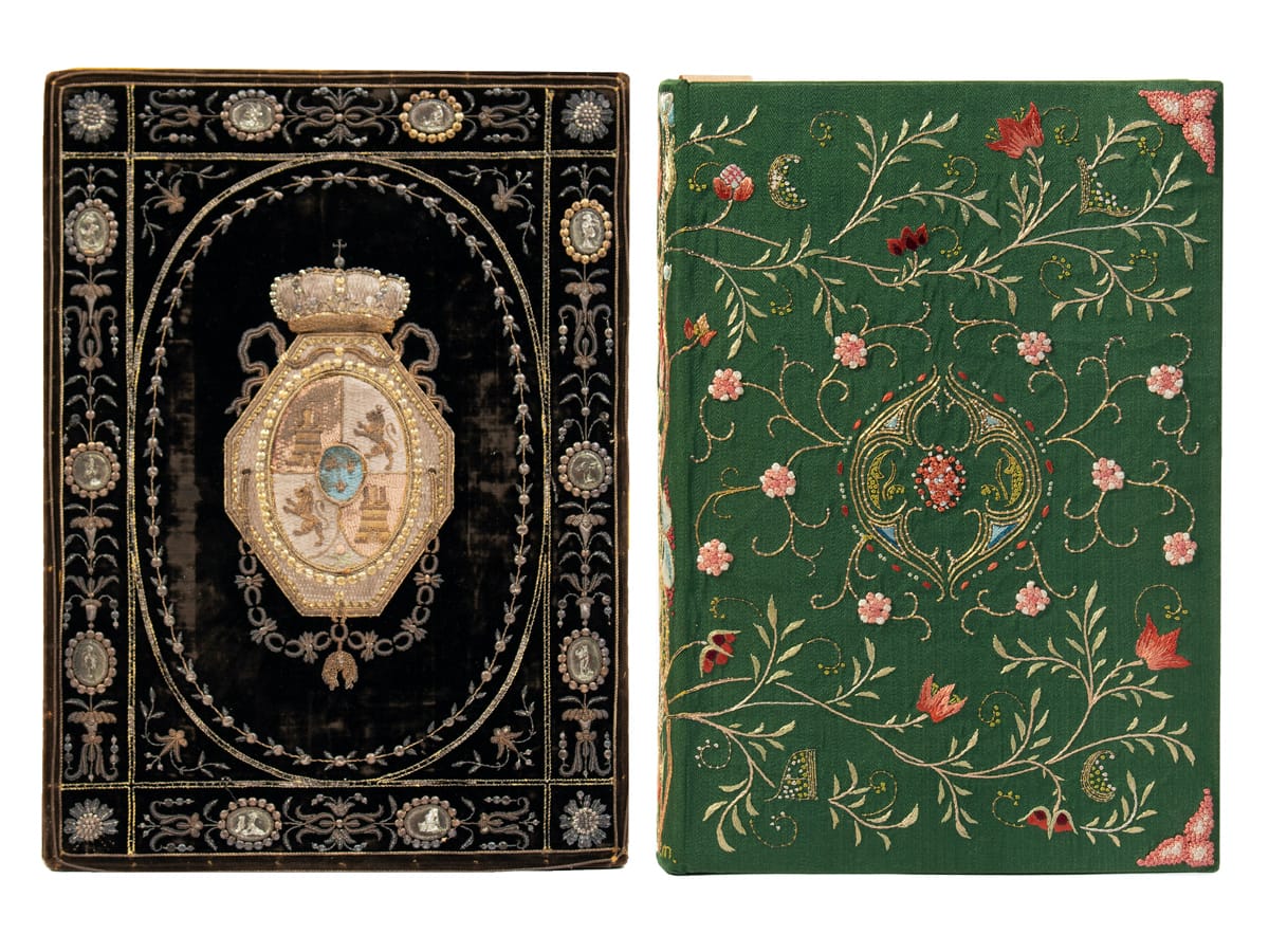 The show features a smattering of over-the-top, heavy-appearing editions inlaid with gems and precious metals. Lace-like silver filigree covers a small 1673 Book of Hours studded with 14 amethysts and oversized enamel portraits of angels and saints. A dramatic black velvet volume, a record of the funeral ceremonies of King Charles III of Spain created for his son, is detailed in gold and silver thread and showcases the family’s crest and silver coins. It was likely made by a congregation of nuns.