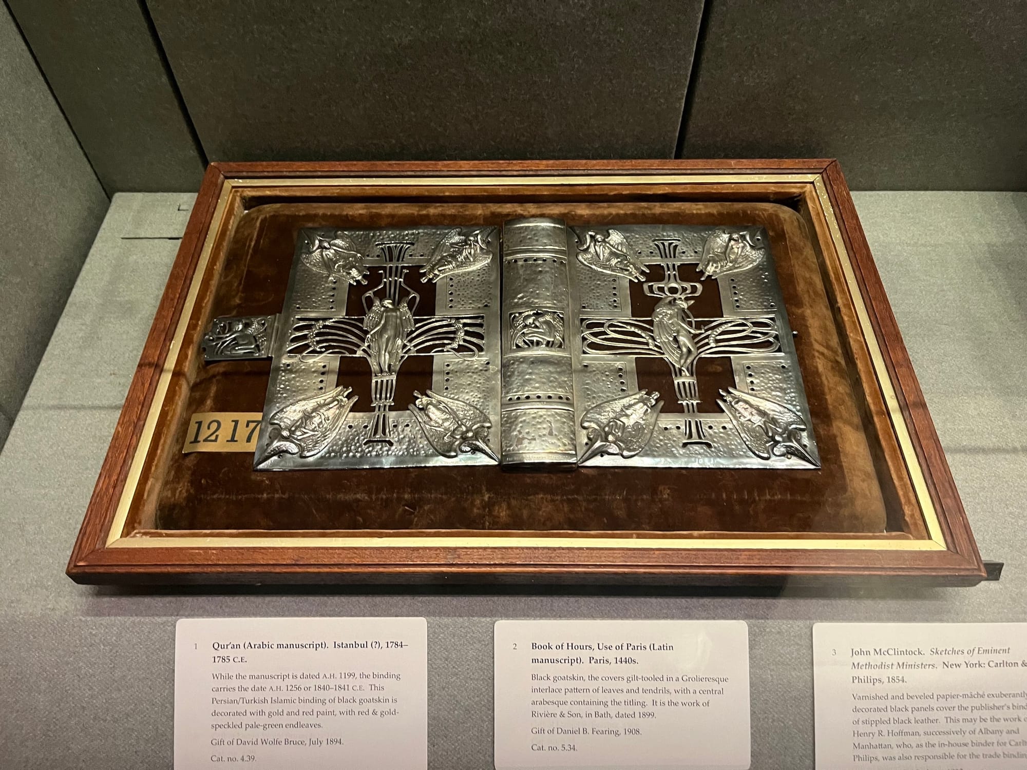 Before commercial publishing houses began producing ready-to-read books, a practice the show's curator H. George Fletcher derided as "gluing," wealthy patrons purchased unbound pages and commissioned artisans to cover them. The craft is still practiced today, though it is rare and expensive. The works in the show vary widely, from a bedazzled late Medieval prayer book to a removable Art Nouveau silver cover to a commercially available copy of a bestseller that ended up on Reese Witherspoon's Book Club list.