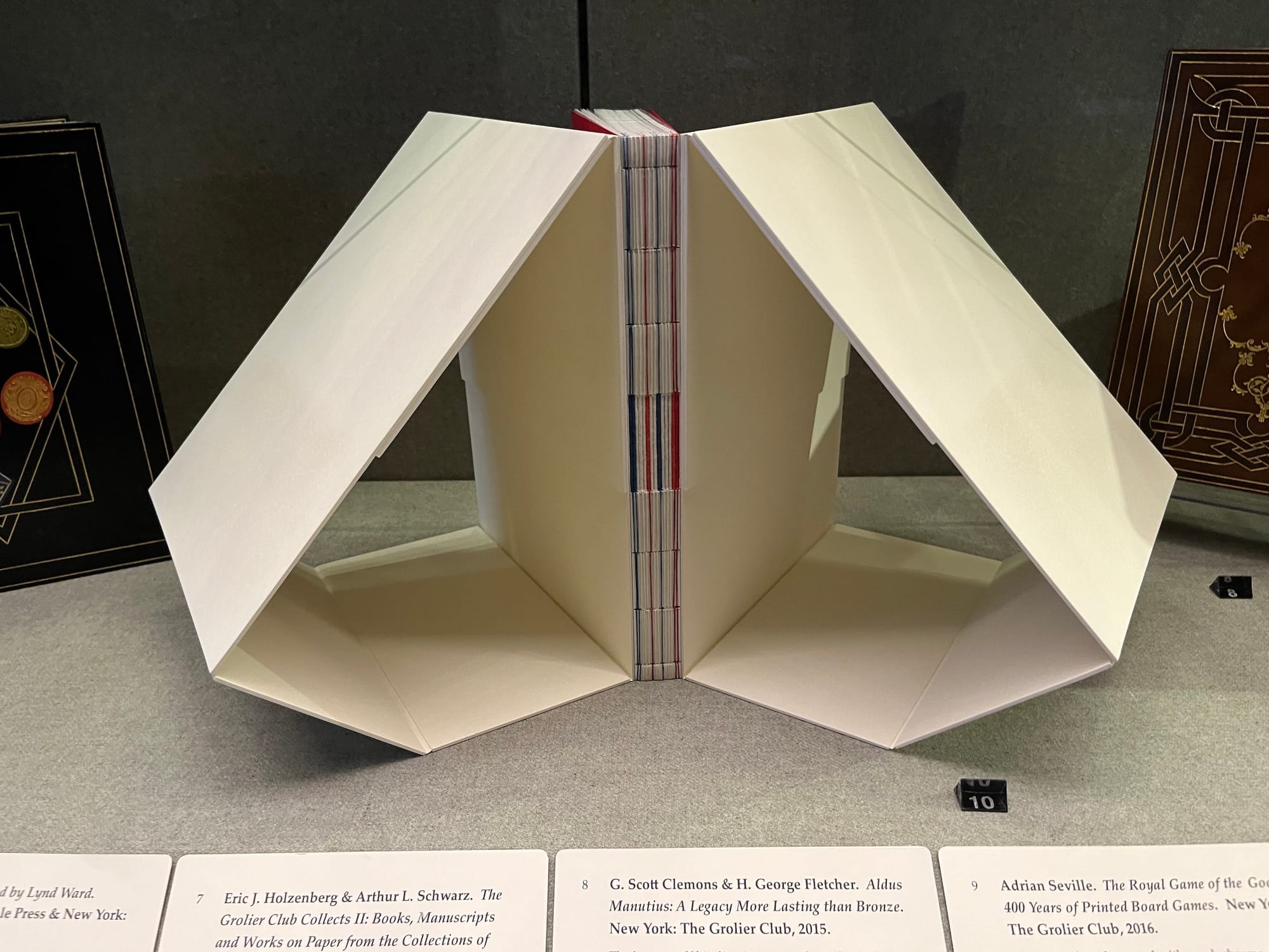 The exhibition concludes with a display of bindings commissioned by the Grolier Club itself. A delightful — and slightly gaudy — 2017 binding of author Mark D. Tomasko's Images of Value: The Artwork Behind US Security Engraving, 1830–1980s (2017) features banknotes inlaid onto red goatskin. An architectural binding of Paul van Capelleveen's Artists & Others: The Imaginative French Book in the 21st Century (2016) comprises vellum-covered boards that converge to form a self-supporting stand.