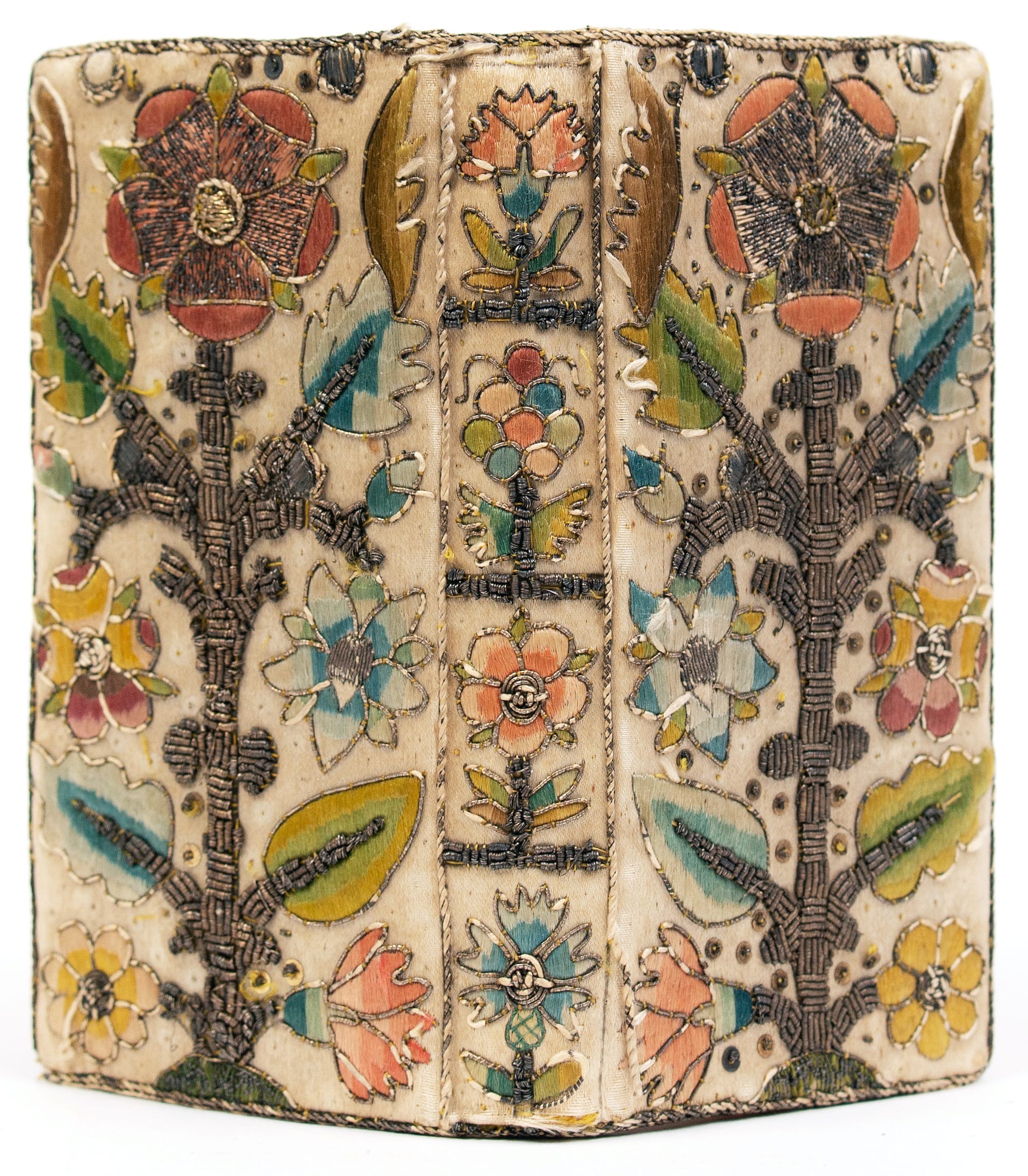 One of the most memorable artworks, however, is a sumptuous but comparatively delicate volume, a 1643 book of psalms created in London. Atmospheric exposure usually turns white silk-bound editions tan and brown, but this cover is a shiny cream color. The polychrome silk and gold metallic threads, which wind around one another to form a colorful floral pattern, maintain an eye-catching vibrancy. The only sign of the book’s age is the oxidized silver “stumpwork,” a type of raised embroidery that in this case resembles beading.