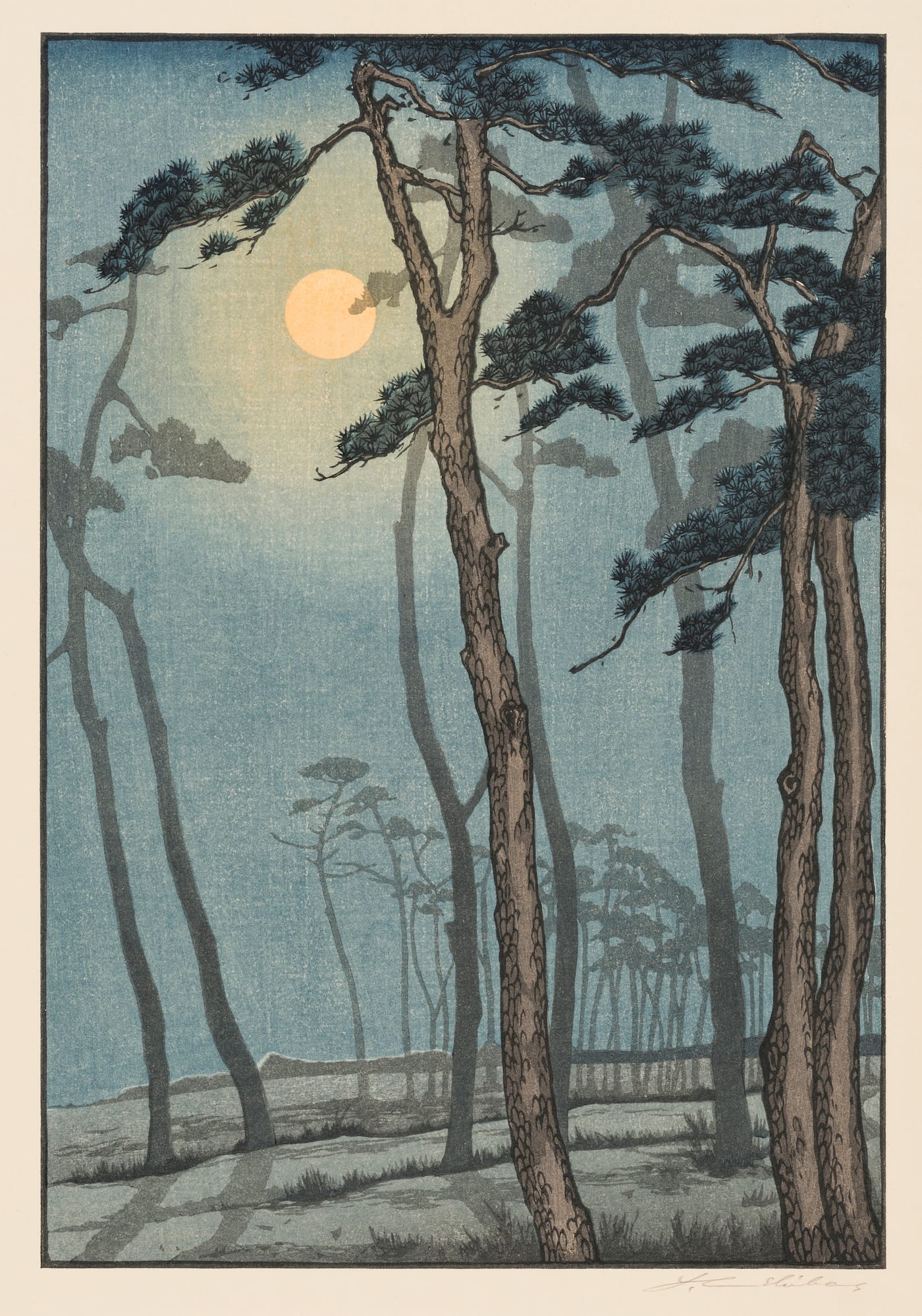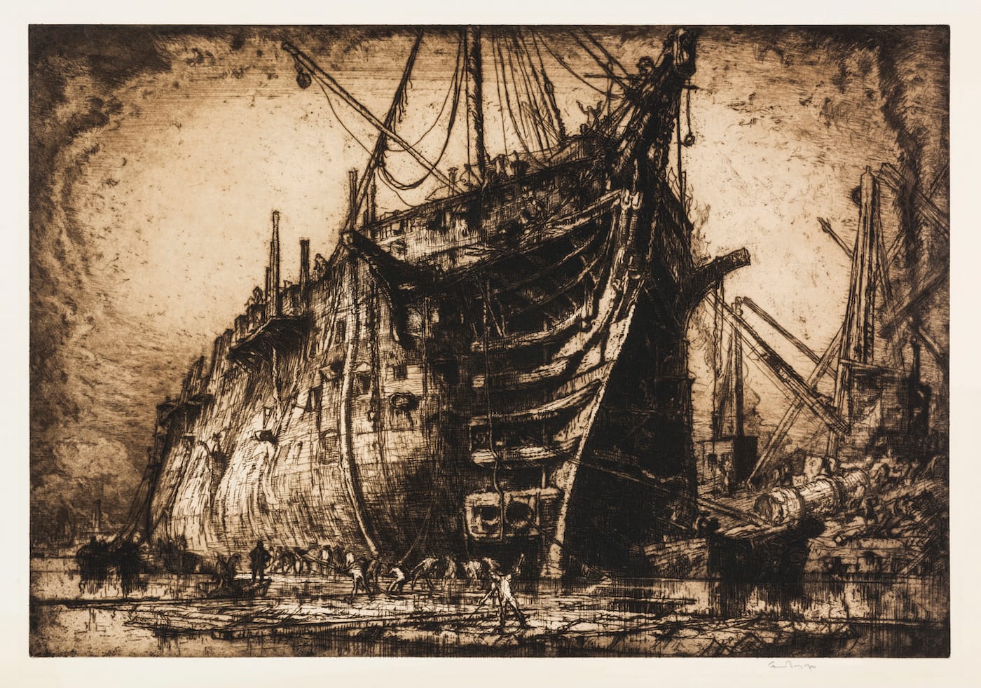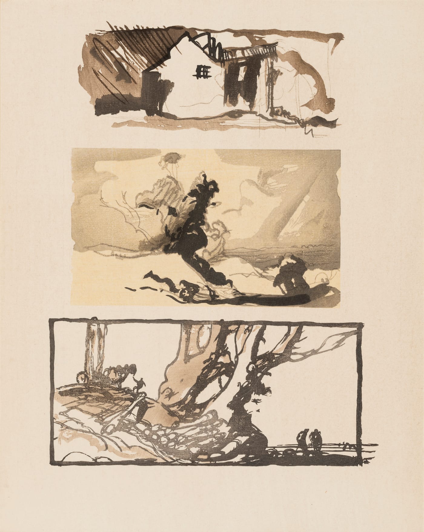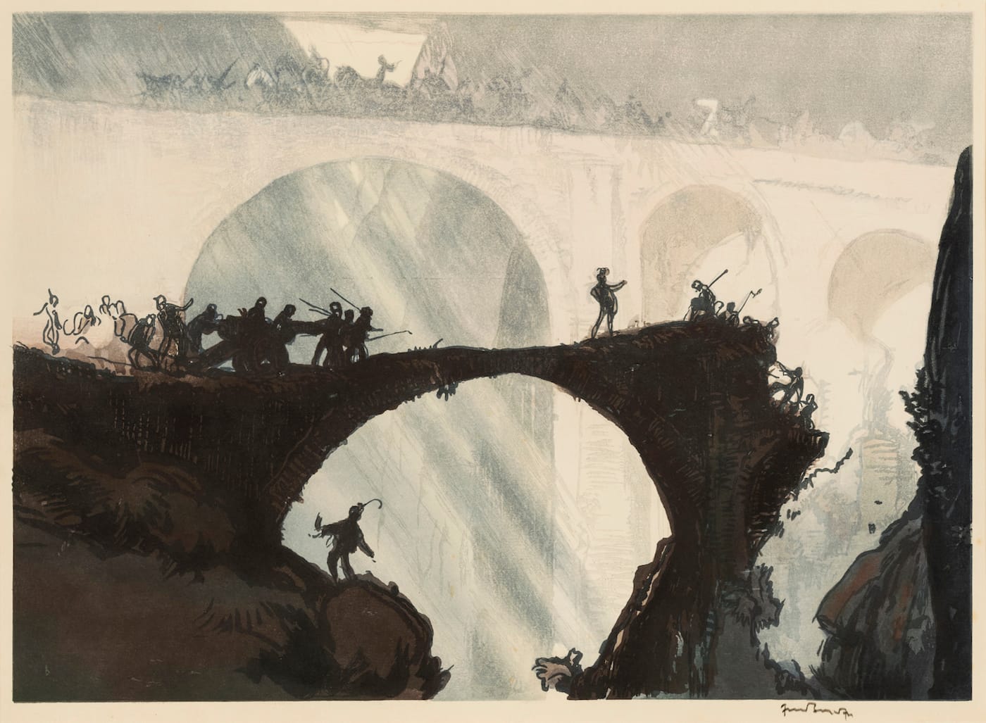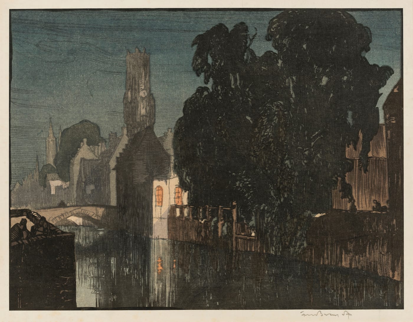 Brangwyn met Yoshijiro Urushibara in the 1910s, after Urushibara had arrived in London to demonstrate woodblock production at the Anglo-Japanese Exhibition in 1910. Sheer Pleasure includes sketches, notes, and prints from their collaboration, such as the 1924 picture “The Devil’s Bridge,” where the layered style of Japanese prints adds depth to a calamitous vista of the broken bridge swarmed with silhouettes, and the inky 1919 series of images of Bruges. Brangwyn was born in the Belgian city, and Urushibara’s color woodcuts gave his designs a deeply tonal texture. “We all know the famous names associated with Japanese prints, Hokusai, Hiroshige, but we rarely have the opportunity to celebrate the contribution of the craftsmen behind the artworks,” painter and printmaker Rebecca Salter, who is showing work she made with Kyoto’s Sato Woodblock Workshop alongside Sheer Pleasure, said in a statement.