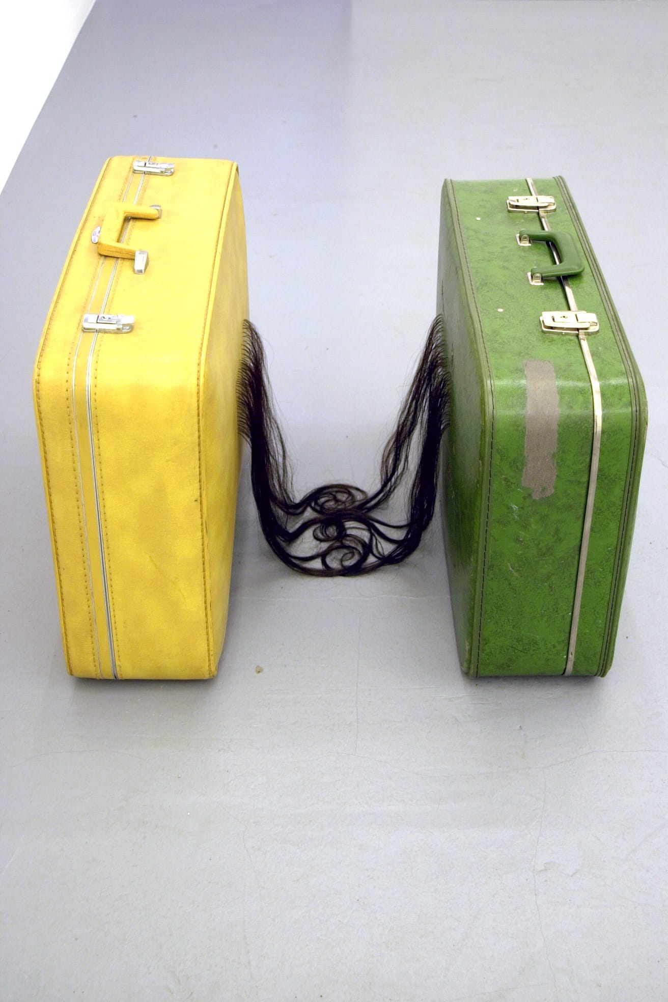 Still, the journey remains a major theme throughout the exhibition. In spaces of transit, where subjects are vulnerable to disappearance and death, objects take on special weight. Objects stand in for the human figure in works such as Mona Hatoum’s enigmatic “Exodus II” (2002), a sculpture that joins two suitcases by a dark cord of human hair, or Kader Attia’s “La Mer Morte” (“The Dead Sea”) (2015), an installation comprised of blue clothing arrayed on the gallery floor, suggesting the tidal remnants of those attempting to reach Europe by the Mediterranean Sea. Camilo Ontiveros also alludes to an absent subject in his “Temporary Storage: The Belongings of Juan Manuel Montes” (2017). Installed in the first gallery, the sculpture is constructed from the household objects of a 2017 DACA deportee. Bound with rope, the crude bindle — twin bed, plaid bedspread, sports equipment, suit coat, and ties — plays on the various meanings of belonging using the language of itinerant movement. The work’s found objects and ad hoc construction also reflect a dominant sculptural vernacular. In the context of this exhibition, such strategies of salvage and assemblage appear to reflect the makeshift methods of people on the move — or perhaps the impulse, among Euro-American artists, to seize eclectic materials from global cultural currents.