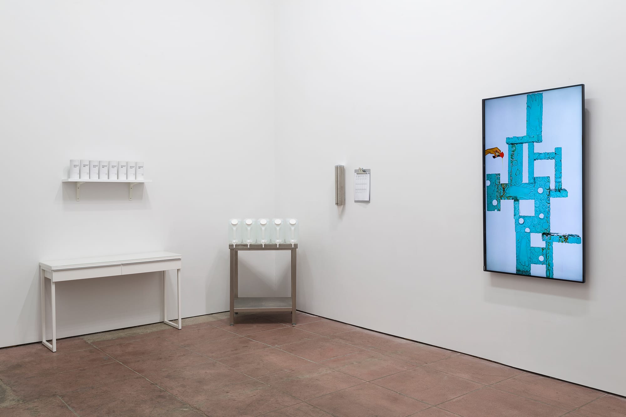 The enduring popularity of “meal replacement” beverage Soylent suggests people can ostensibly meet their nutritional and caloric needs through liquid form, no matter how joyless or dystopian the idea might seem. Sean Raspet’s installation features a display of Soylent containers labeled “technical food” and “technical milk,” and invites gallery visitors to try out samples of five chemically flavored waters, the titles of which only reveal their specific chemical compounds. A survey asks visitors to describe their tastings, which range from the mildly pleasant (hints of cinnamon and vanilla) to the outright abhorrent (scents of rubber and plastic), turning the installation into a case study for the perception of “natural” and “artificial” flavors and the mimetic capabilities of taste and smell.
