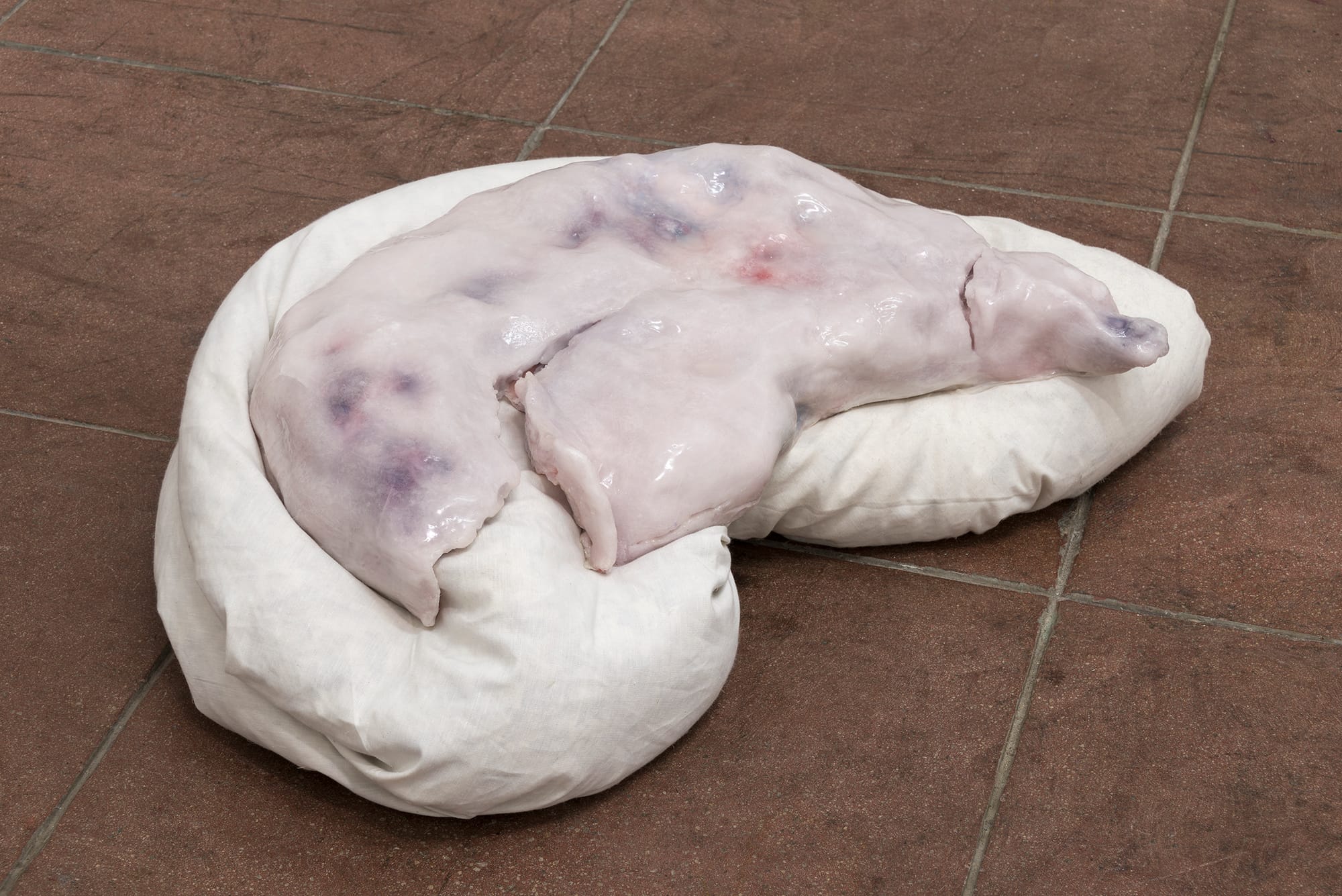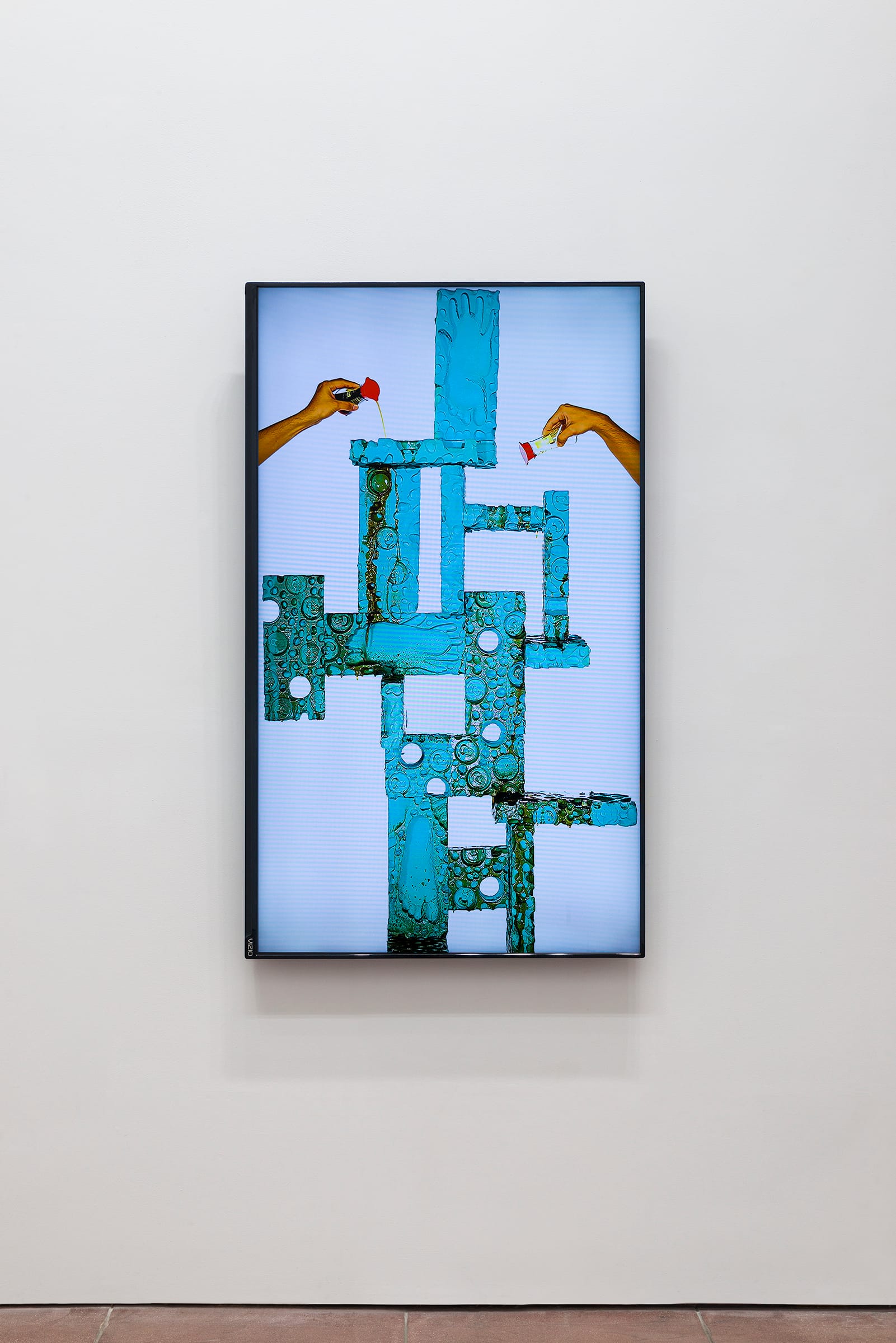 Preservatives and hormones make up a substantial part of our industrial food supply, while waste and plastics are reconstituted into food we regularly consume. Despite our heavy reliance on artificial substances, the stigma of the artificial persists. Synthetic materials like wax, silicone, and linoleum mimic the organic finish of fleshly organs and human skin in Ivana Basic’s sculptures resembling body parts produced in vitro. Nicolas Lobo’s video “Hongshuai Indoor Fountain” depicts rivulets of soy sauce dripping down impressions of aluminum cans and footprints — a reference to the recycling of human waste, in this case hair that was allegedly used by a Chinese company to create amino acid syrup for the production of soy sauce.