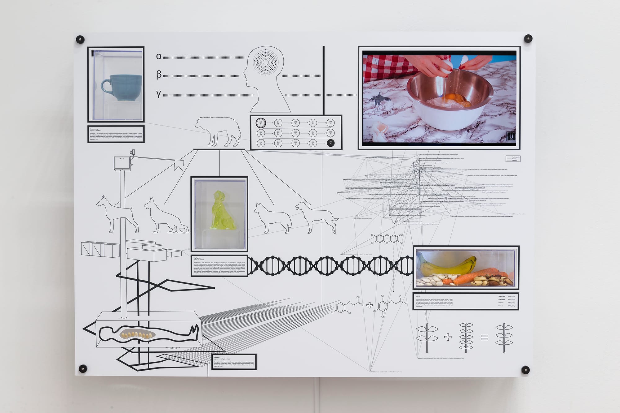 In “Display Unit, U-238,” Encyclopedia, Inc. traces a brief history of the use of radioactive materials in consumer goods. Examples of objects with trace amounts of uranium (an old glass figurine, ceramic mug, and dentures) comprise the wall display, while a vitrine containing bananas, carrots, brazil nuts, and lima beans is accompanied by text describing the foods as examples of the “most naturally radioactive.” The perceived safety and danger of domestic goods are further complicated by a video titled “Yellowcake,” which references the name of the powdered form of uranium and demonstrates the use of a consumer-grade cake mix.