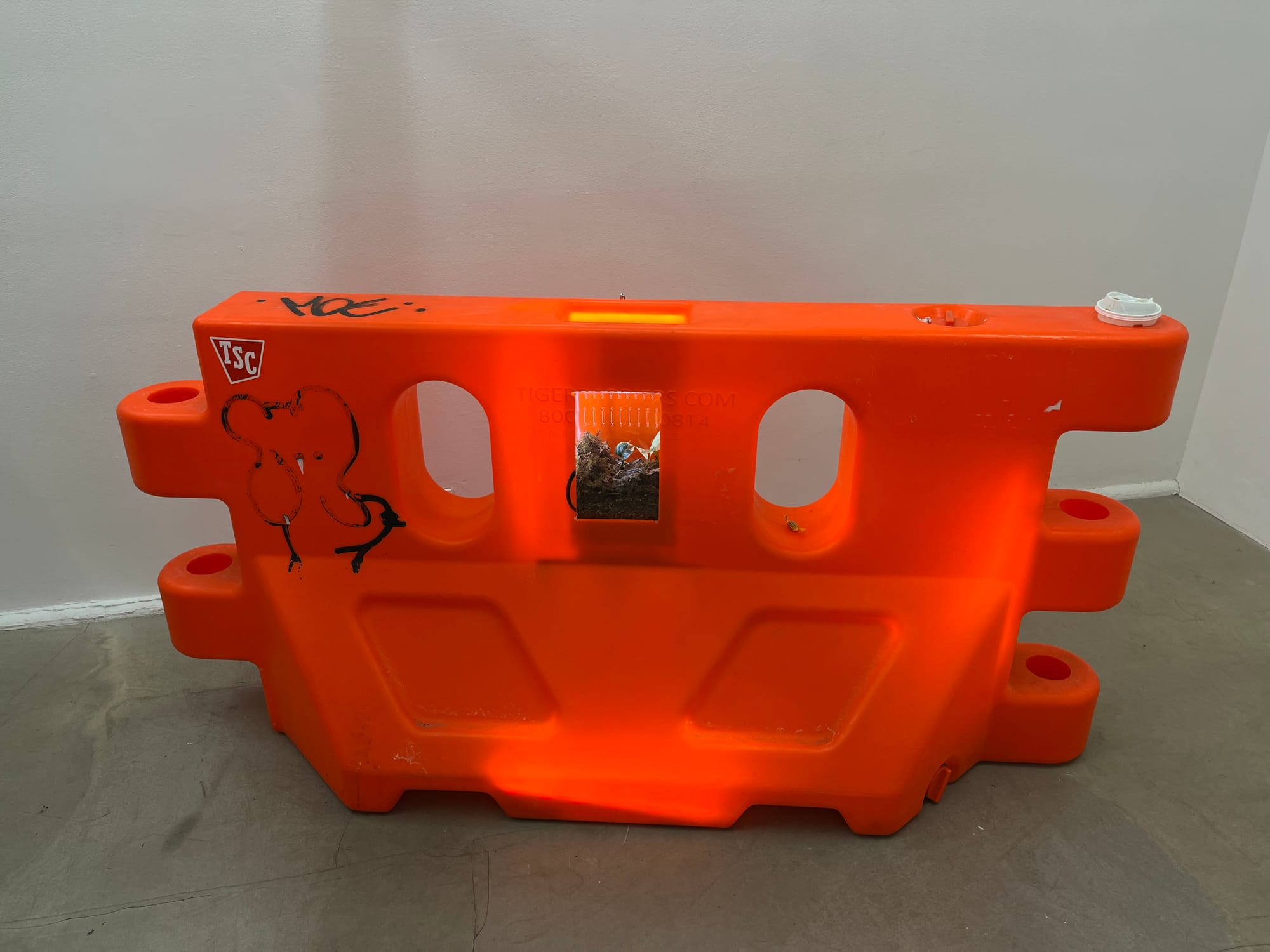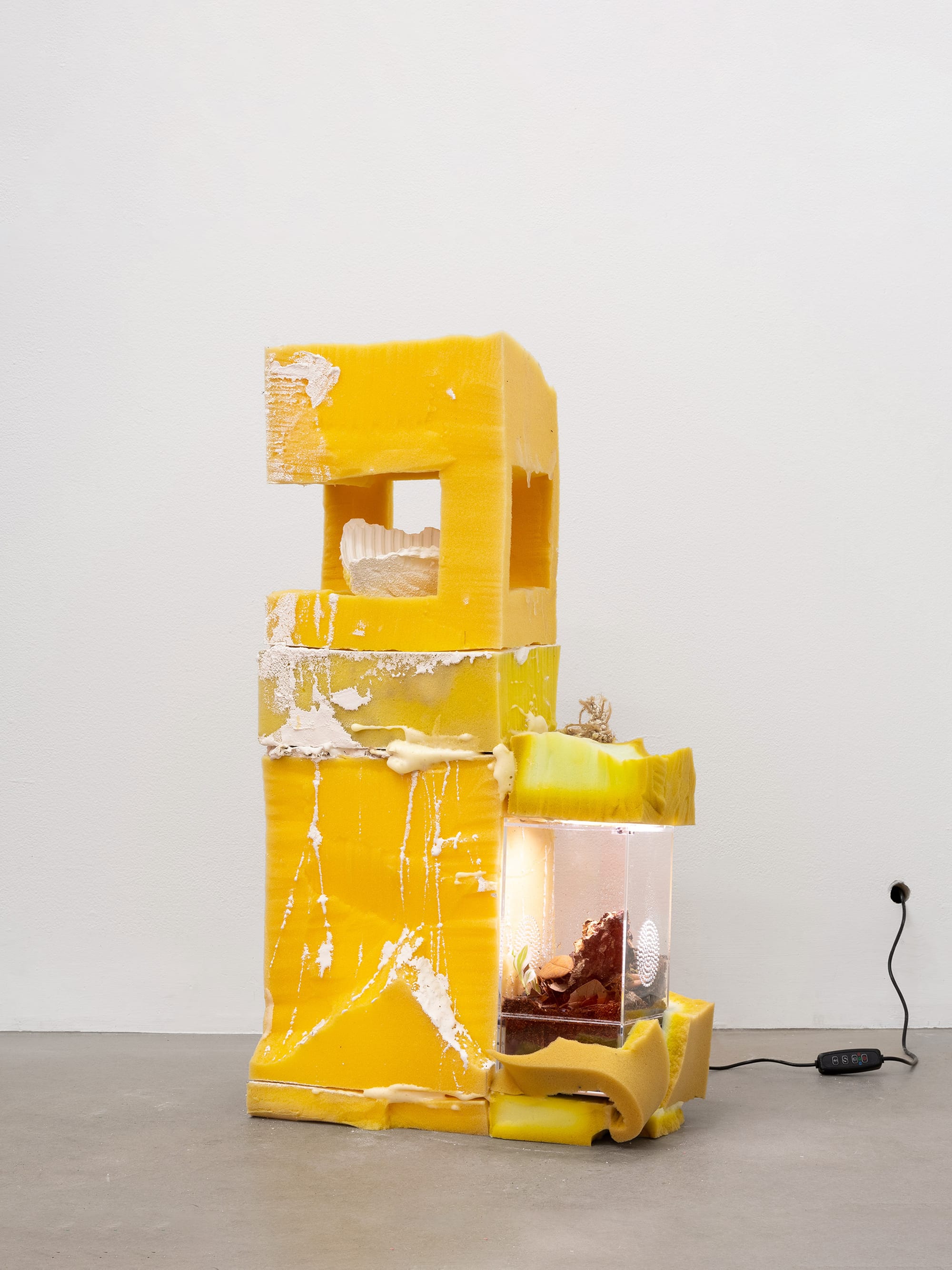 A handful of small isopods and springtails live in Kay Kasparhauser’s gritty Entrance gallery exhibition, New Decay, but, unusually for bio art, these creatures aren’t the stars of the show. What stands out instead are the makeshift habitats the artist has fabricated for them. One terrarium is embedded in a precarious foam tower (“Bonkio,” all works 2025). Another is wedged inside an orange traffic barrier, whose other openings contain trash and stagnant water (“Every time i think I’m absolutely going to die I love you so much I love you so much”). Various foam assemblages, pocked with odd apertures, dangle from the basement gallery’s ceiling and walls. These dilapidated sculptures evoke a subterranean city built for critters.